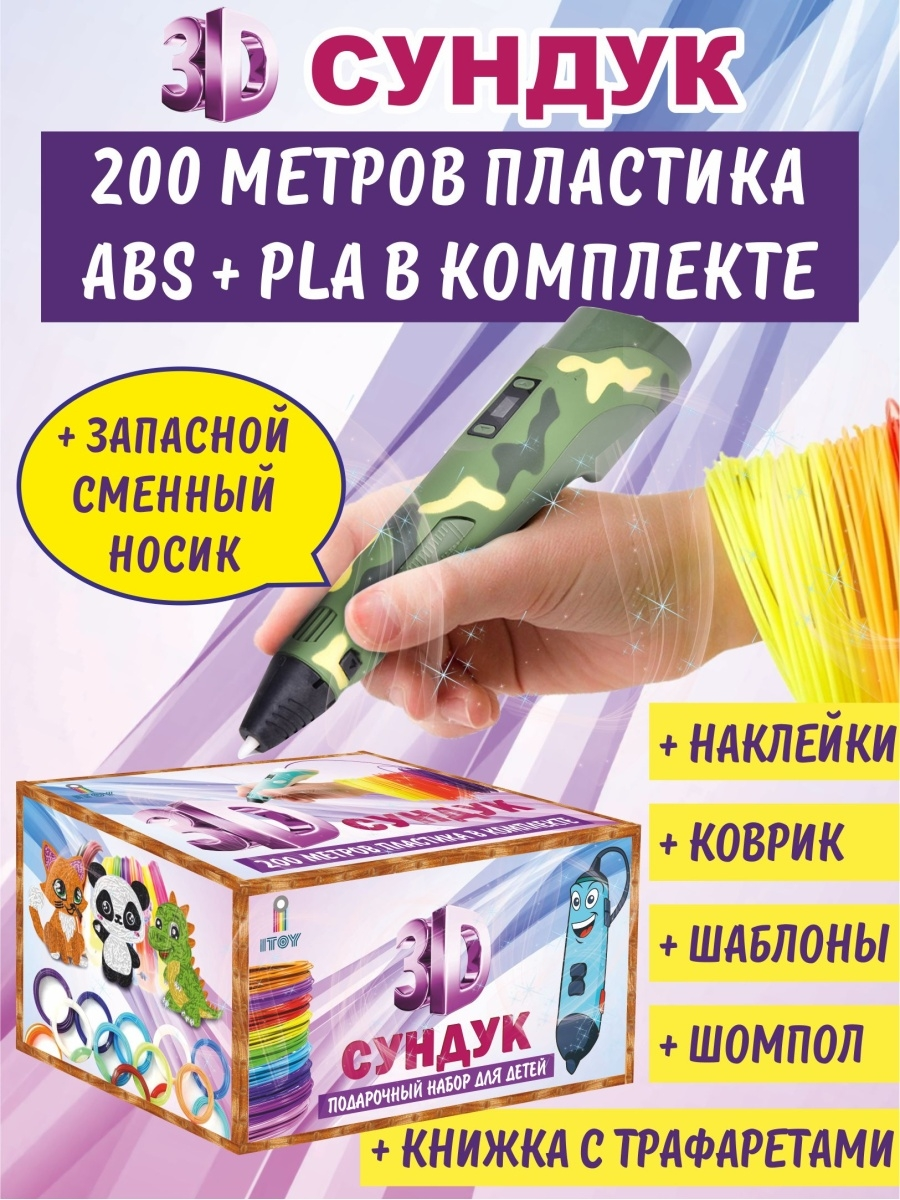 Самый большой и лучший набор с 3д ручкой в России! 1. Оригинальная качественная 3Д ручка с гарантией 2 года 2. В 3Д Сундук включён запас пластика - 20 разных цветов, суммарно 200м + бонус набор 3 цвета. Весь пластик 100% совместим с 3d ручкой - прекрасно плавится и не застревает. В наборе есть как ABS, так и PLA пластик. Попробуйте оба типа пластика и выберите тот, который подойдет именно вам. 3. Памятка по пластику поможет легко определить его тип согласно цветовой палитре, научит сделать так, чтобы ручка служила долго и пластик не застрял. 4. Ребёнку будет интереснее и проще осваивать 3д ручку, тк в набор уже входят трафареты, разные шаблоны и прозрачный коврик. Он позволит использовать трафареты много раз. 5. Запасной носик для 3d ручки самая необходимая запчасть и выручит во многих случаях, когда 3Д ручке требуется ремонт. 6. Чтобы 3D ручка прослужила дольше и не сломалась от забивки. остатками пластика, в наборе есть сервисный шомпол. 7. Наклейки станут приятным сюрпризом для ребенка.