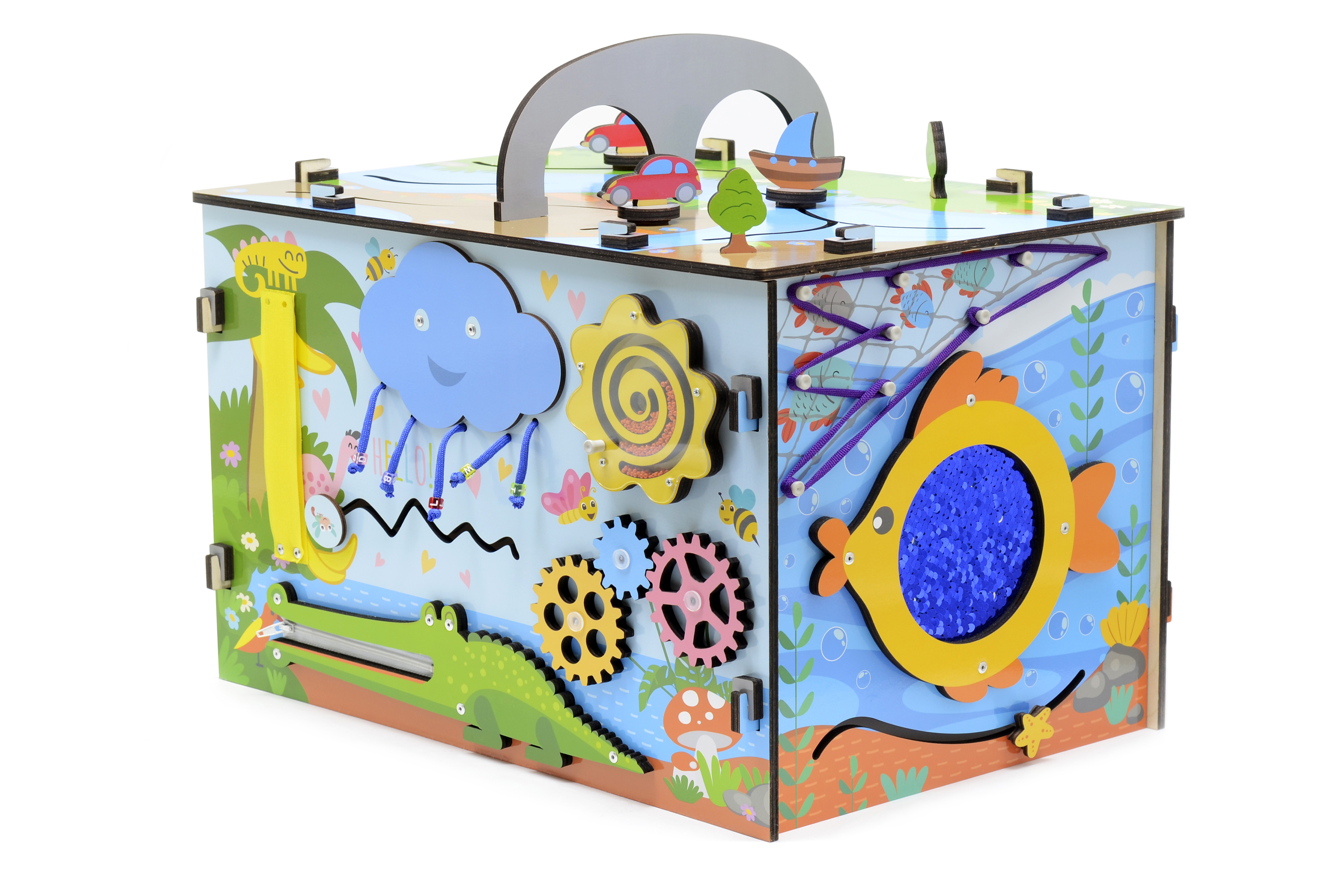 Бизиборд "Вокруг света" разнообразит забавы вашего ребёнка. Ведь теперь можно экспериментировать с элементами из разных материалов, придумывая приключения! Пусть малыш расскажет, какой уголок мира ему полюбился больше всех! По морям и океанам… Взгляните на этот необычный бизидом! Каждая сторона игрушки имеет свой сюжет и набор развивающих заданий. Стоит пальчикам коснуться маленьких рычажков, и все фигурки приходят в движение: кролик, крокодил, краб, птицы и насекомые оживают. Машины и лодки отправляются в путешествие, даже солнце крутится, а внутри него яркий бисер! Откройте иллюминатор корабля – в нем увидите важного капитана. Он предлагает вам бросить якорь, поплавать на глубине и найти сундук с сокровищами. Натяните сеть и хвалитесь богатым уловом! Погладьте рыбу с волшебной чешуёй цвета морской волны, которая от прикосновения становится серебристой! Поиграйте с озорными шнурочками, молнией и липучкой и покрутите шестерёнки. Пусть сказки рождаются сами собой! Чем полезно Бизиборды положительно влияют на сенсомоторное развитие. Работа с яркой конструкцией стимулирует воображение, речь и логическое мышление. Воспользуйтесь свободным временем, пока малыш занят игрой!