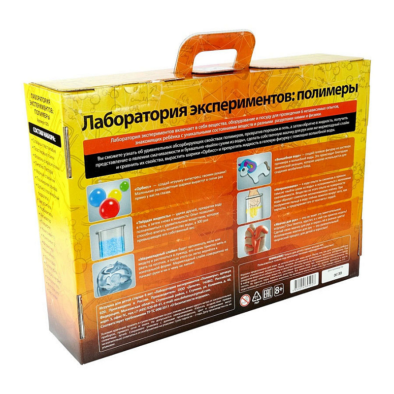 6 экспериментов c полимерами в красивом подарочном наборе. Лаборатория экспериментов включает в себя вещества, оборудование и посуду для проведения 6 независимых опытов, знакомящих ребенка с уникальными состояниями веществ и разными разделами физики и химии. «Полимерные шарики Орбисс» – создай игрушку-антистресс своими руками! Маленькие разноцветные шарики вырастут в сотни раз прямо у вас на глазах. «Твёрдая жидкость» - удиви друзей, превратив воду в гель, а затем снова в жидкость! Опыт позволяет познакомиться с удивительным веществом, которое способно впитать количество воды, в 300 раз превышающее его собственный вес. «Мармеладный слайм» - этот слайм будет напоминать желе или медузу и растекаться в лужицу, его очень приятно мять и рвать на кусочки, а после этого он легко вернётся к изначальной форме. Медуза-слайм совершенно не пачкает руки и ни к чему не липнет. «Волшебная вода» - создай 3D фигурку с помощью волшебной воды, формочки и раствора полимера. Это происходит благодаря химической реакции, которая широко используется для создания необычных блюд. «Непромокашка»- в ходе опыта ты сможешь в прямом смысле «выйти сухим из воды» и познакомиться с явлениями смачиваемости. Вещество из этого опыта на поверхности воды образует сомкнутую несмачиваемую пленку. При погружении пальца в воду пленка ложится вокруг него, как перчатка, и предохраняет его от контакта с водой. Подарочная упаковка - коробка-чемоданчик. 8+