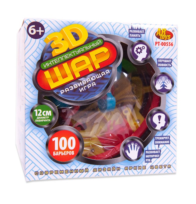 Яркая головоломка в виде шара с лабиринтом внутри. Выполнена из прочных и безопасных для здоровья материалов. Позволит развить логику, усидчивость, внимательность и просто весело провести время. Удобно брать с собой в дорогу. Для детей старше 6 лет. Интеллектуальный шар 3D, в коробке, 100 барьеров, диаметр лабиринта 12 см. Комплектация: — шар с лабиринтом и шариком внутри, — инструкция. Функции: — развивает самодисциплину, — развивает восприятие пространства и чувство равновесия, — развивает логическое мышление, — развивает навыки работы с объектами. Дополнительно: Для детей от 6-ти лет. Размер упаковки (д/ш/в): 12,1x12,1x12,1 см. Вес: 153 гр. Для работы батарейки не требуются.
