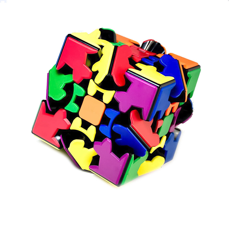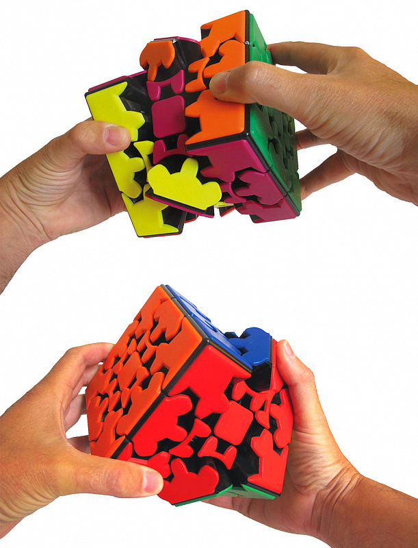9+.Подарочная головоломка размером 12см (!) на деревянной мини-паллете. Без наклеек: вместо них здесь цветные пластиковые плитки, красивые и долговечные. Весь механизм, все шестеренки расположены на виду, что придает кубу крайне загадочный вид. Безусловно, головоломка напоминает кубик Рубика, хотя по сложности она значительно проще. Шестеренки вносят свой вклад в особенности сборки. Тут потребуется целых 12 поворотов на 90º, чтобы провернуть весь кубик и вернуться в изначальное состояние. В целом же, большинство поворотов этой головоломки потребуют вращения на 180°. Привычные по кубику Рубика повороты на 90º будут приводить Gear Cube в промежуточное состояние, не позволяющее вращать головоломку в других плоскостях. Для продолжения сборки потребуется завершить полный 180° поворот в выбранной плоскости. Метод сборки состоит из 3 этапов: 1) Нужно привести головоломку в форму куба - это достаточно просто. 2) Нужно расположить цвет так, чтобы на каждой стороне были только 2 цвета (противоположные) - это чуть сложнее, но тоже осуществимо. 3) Полностью собрать эту головоломку в целом проще, чем собрать классический кубик Рубика. Интересный факт: Первая версия этой головоломки была названа Опасный Куб. В первоначальном механизме шестеренки были достаточно острыми, и во время поворотов можно было прищемить палец. Современная версия абсолютно безопасна. У неё доработанный механизм и круглые зубья шестеренок. Сложность: 4/5 Размер куба - 12х12х12см