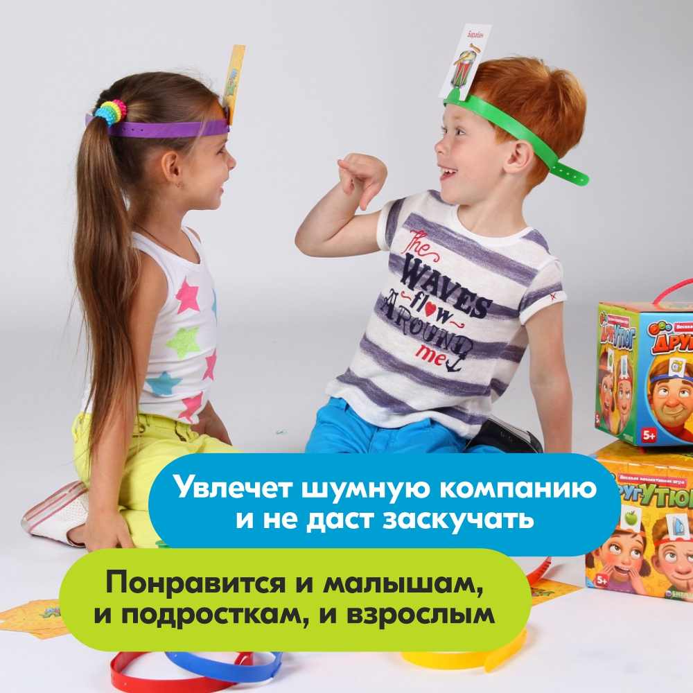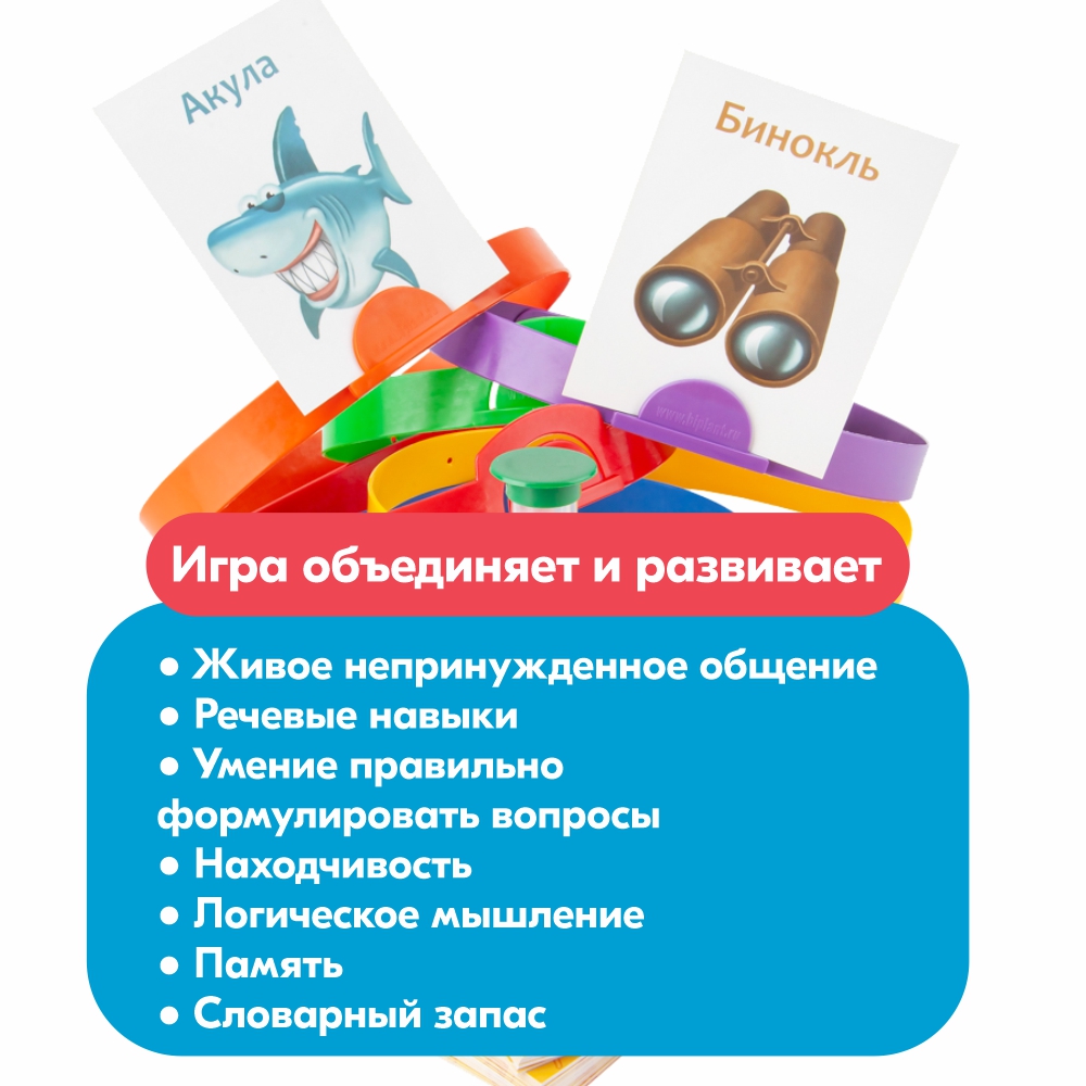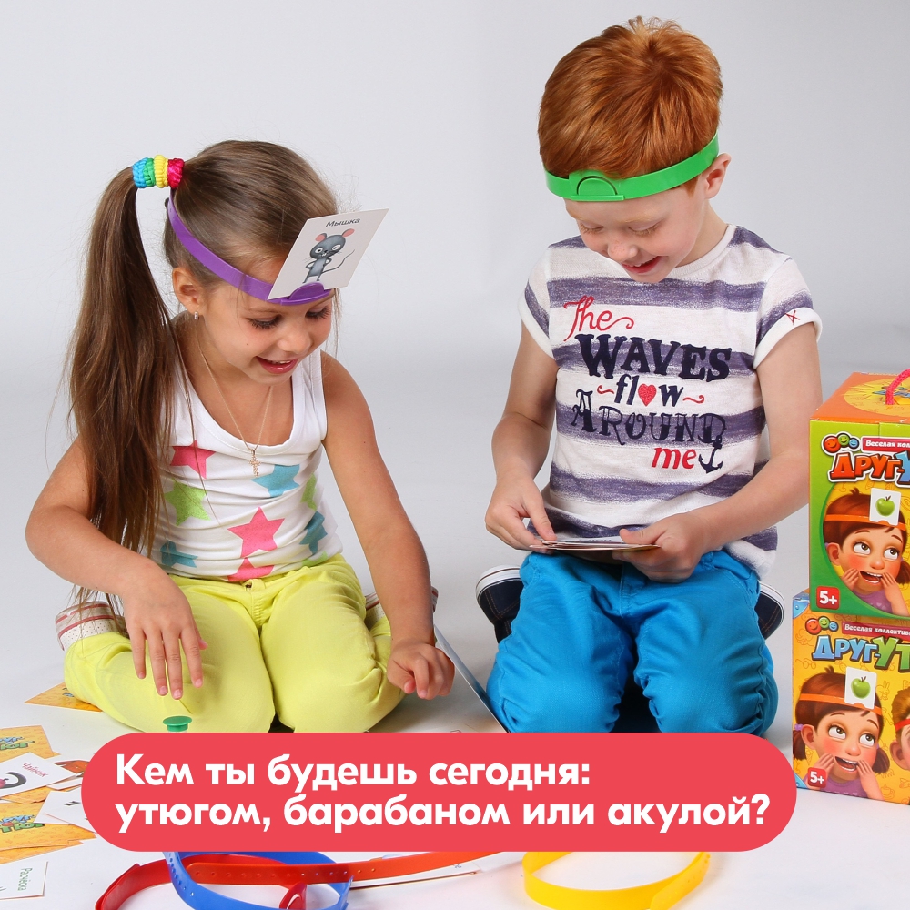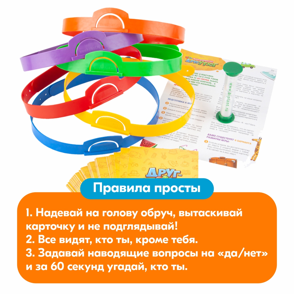 Возраст: 5+. Веселая и азартная игра, которая увлечет всю шумную компанию и не позволит никому соскучиться (или отсидеться в углу). Отличное развлечение на детских праздниках. В комплекте 6 обручей 70 игровых карточек с различными предметами/животными Песочные часы Кем ты будешь сегодня, решает только удача! Надевай на голову обруч, вытаскивай карточку, и не подглядывай! Ведь карточка определяет, кем ты будешь сегодня: утюгом, барабаном или любым другим предметом, едой или животным. Вся остальная честная компания видит, кто ты, кроме тебя. И твоя задача — угадать, кем же ты сегодня стал, задавая наводящие вопросы. Будь внимателен: отвечать тебе могут только «да» и «нет», а время ограничено 60 секундами. Во время игрового процесса между участниками устанавливается живое и непринужденное общение. При этом каждый ребенок учится трезво мыслить в ситуации ограниченного времени, правильно формулировать вопросы. Развивается находчивость, стимулируется аналитическое и логическое мышление, укрепляется память. Проверьте свою смекалку, память и умение анализировать информацию. И ответьте на главный вопрос: кто же вы? Утюг, слон, а может, яблоко? Игра предназначена для 2-6 участников от 5 лет. Игра «Друг-утюг», комплектация 70 карточек со словами 6 гибких пластмассовых обручей песочные часы на 1 минуту инструкция