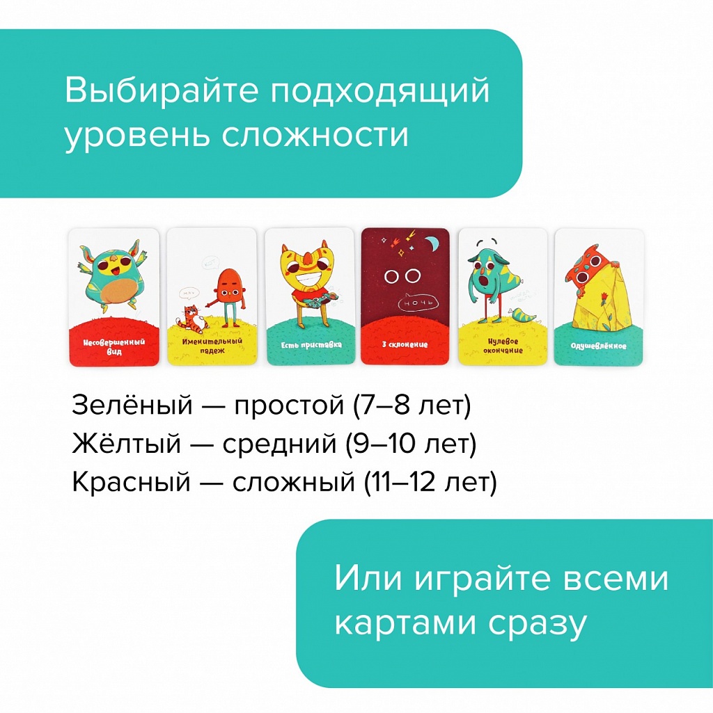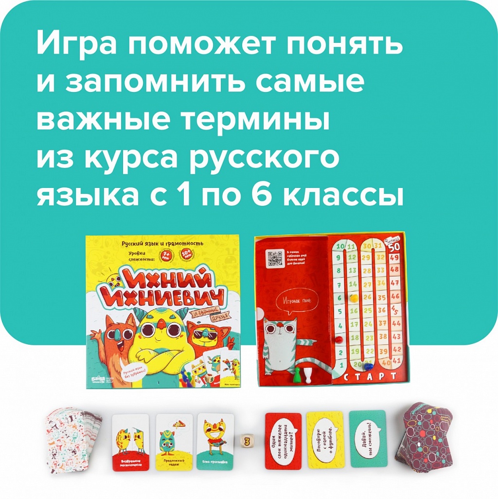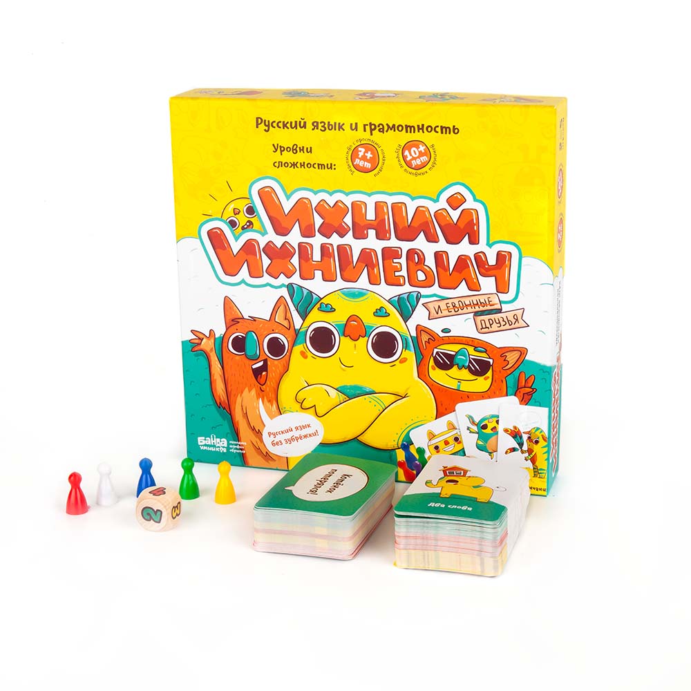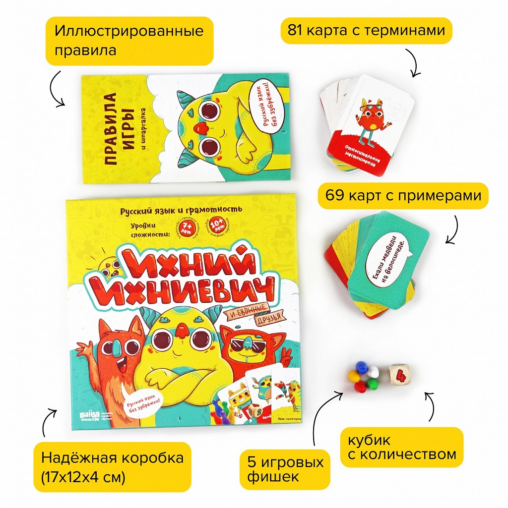 7+.Русский язык учить тяжело. Это неудивительно: столько разных правил, скучные учебники! «Ихний Ихниевич» — это уникальная настольная игра, которая помогает понять и запомнить самые важные термины из курса русского языка с 1 по 6 классы. Ведь играть намного интереснее, чем читать очередной параграф. 7+ лет: знакомство с простыми понятиями. 10+ лет: изучение основных терминов. Для чего? Уникальная игра учит детей разбираться в терминах русского языка. Это вам не скучный параграф № 78 из учебника, а веселая и азартная настолка, в которой понадобятся знания и воображение! Как выиграть? Все просто — нужно придумать и назвать как можно больше фраз, соответствующих выложенным картам с терминами из курса русского языка с 1 по 6 класс. Побеждает самый проворный и сообразительный игрок, первым набравший 50 очков! В комплекте 81 карта с терминами 69 карт с примерами Кубик с количеством 5 игровых фишек Иллюстрированные правила Шпаргалка по русскому языку.
