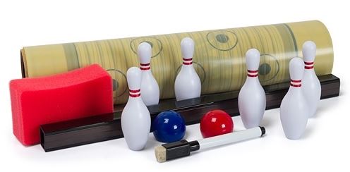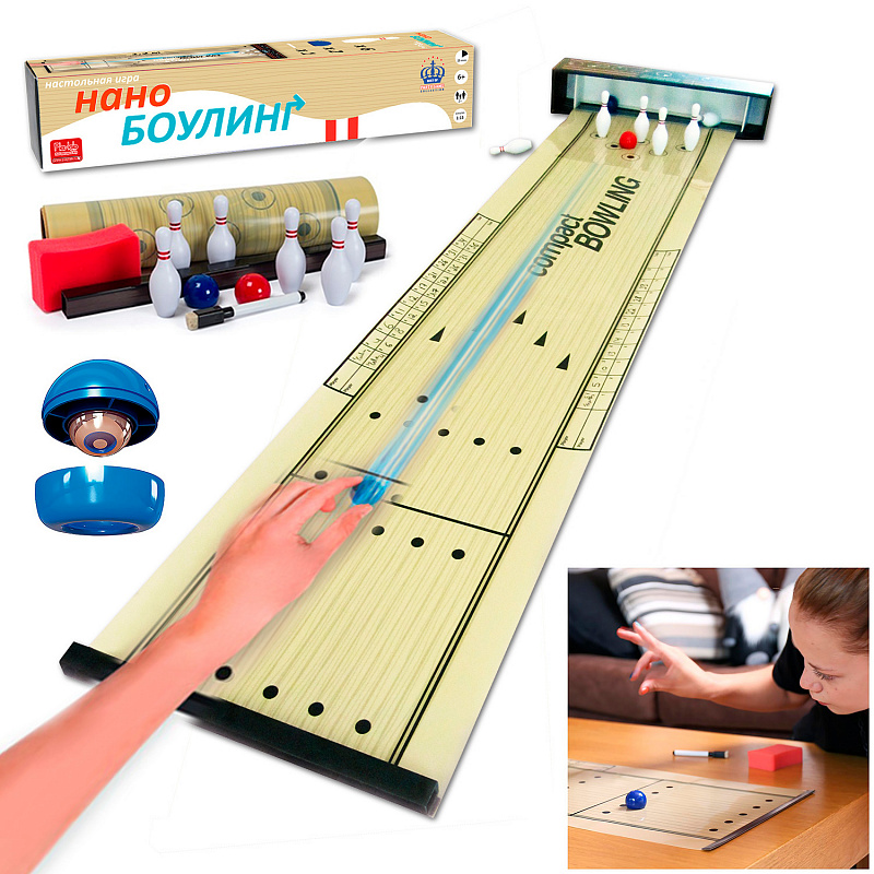 Легкая и веселая настольная игра для любого возраста. Просто разверните дорожку и расставьте 6 кегль в дальнем конце поля. Теперь можно начинать сшибать кегли фишками-шарами. Как и в настоящем боулинге, можно сыграть в несколько быстрых "фреймов" или же устроить настоящий турнир. Сбитые кегли никуда не улетят - в конце дорожка снабжена магнитной полосой, с помощью которой к ней крепится коробка от игры. Получается что-то вроде ворот, которые собирают сбитые кегли и "шары", вылетающие за дорожку. Можно играть в командах или набирать очки в индивидуальном зачете. Для ведения счета по бокам дорожки сделана специалная таблица, которую нужно заполнять стирающимся маркером для доски whiteboard (в комплекте!). После игры просто сотрите записи и начинайте снова! "Фишка" игры - тяжелые мячи с металлическим сердечником. Ощутимый вес и инерция обеспечивают динамику, как в настоящем боулинге! Запущенный мяч с грохотом сбивает установленные в дальнем конце игрового поля кегли. Кегли со смещенным центром тяжести уверенно