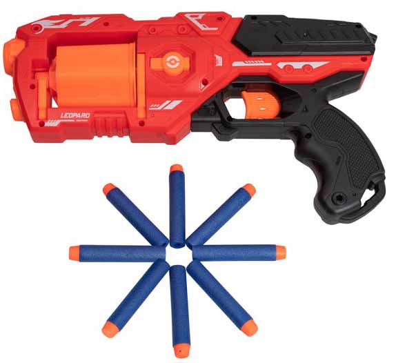 Игровой набор с пистолетом и 8-ью пулями. Размер пистолета составляет 31,5*5*18,5 см. Размер пули составляет 7*1,3 см. Пули имеют тупой наконечник. Материал пуль – EVA и TPR. Комплектность: пистолет, 8 пуль. Как играть: нажать на кнопку на боковой панели –выдвинется вбок барабан. В барабан можно разместить 6 пуль. Барабан необходимо задвинуть обратно в корпус пистолета. Перед выстрелом необходимо оттянуть затвор. Далее – нажать на курок. Дальность выстрела составляет примерно 8-12 метров.