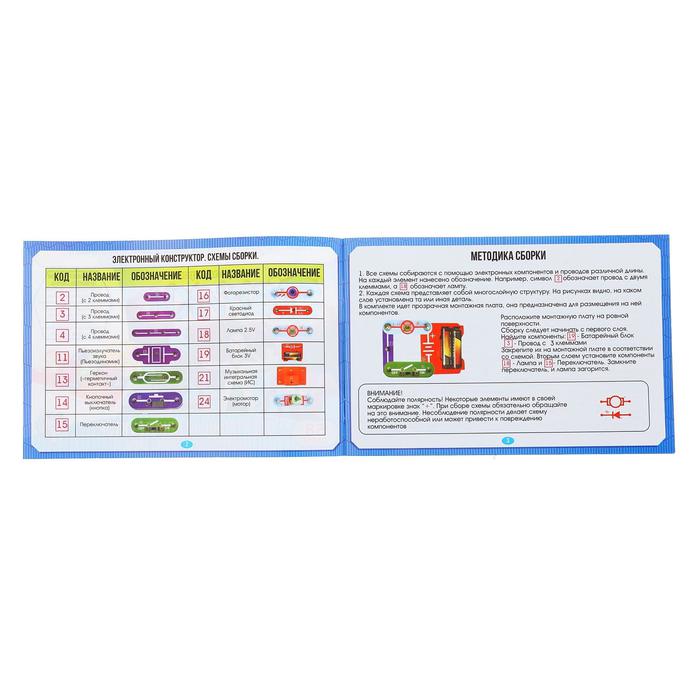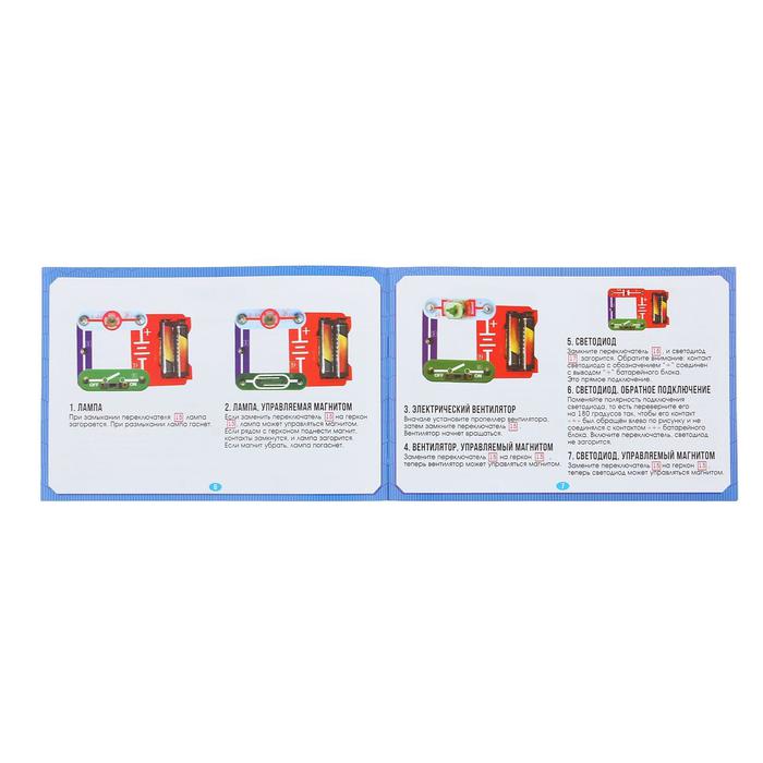 8+.В наборах вы найдёте подробную инструкцию с описанием каждого шага. Конструктор предназначен для сборки различных простых электронных схем. Соединение элементов между собой производится с помощью специальных кнопочных креплений — это удобно, легко и быстро. Собранные схемы не требуют настройки и начинают работать сразу. С этим конструктором вы соберёте: летающий пропеллер; светящуюся лампочку; FM-радио; электрический вентилятор; простой телеграф.