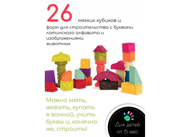 6М+.Стройка от А до Z. Двадцать шесть мягких кубиков и форм для строительства с буквами латинского алфавита и изображениями животных. Можно мять, жевать, купать в ванной, учить буквы и, конечно же, строить! Удобная сумочка для хранения.