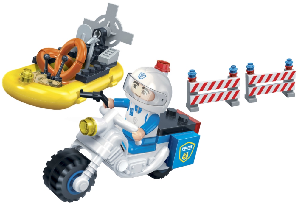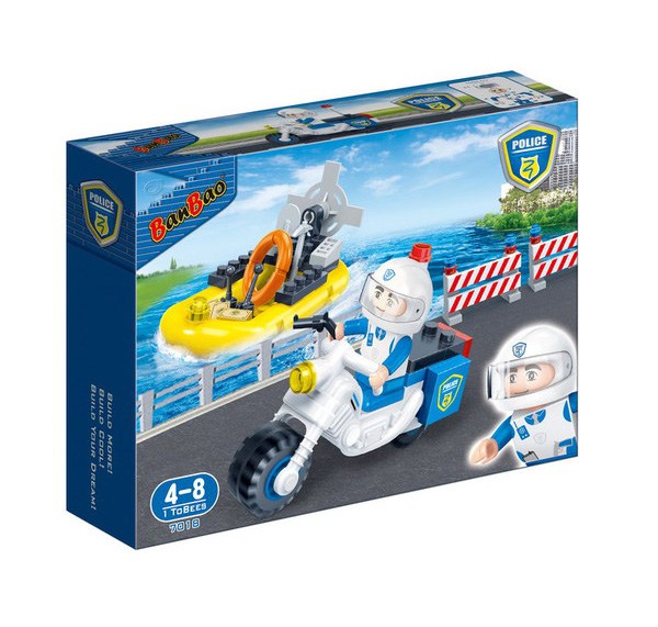 Полицейский на скутере легко проедет туда, куда невозможно добраться на машине или грузовике. Помимо этого, он ловко управляется с моторной лодкой. Вы можете часто встретить этого парня на пляже БанБао, наблюдающего за порядком. Набор станет прекрасным расширением Вашей полицейской коллекции. Скутер — удачное транспортное средство в местах большого скопления людей и узких дорог. Он может пригодится Вам на пляже или в парках БанБао для обеспечения порядка. Набор включает в себя скутер и лодку, а также фигурку полицейского. модель:Banbao 7018 размер упаковки:16*10*3.5 фигурки ToBees:1 персонаж количество деталей:61 блок уровень сложности:1/5