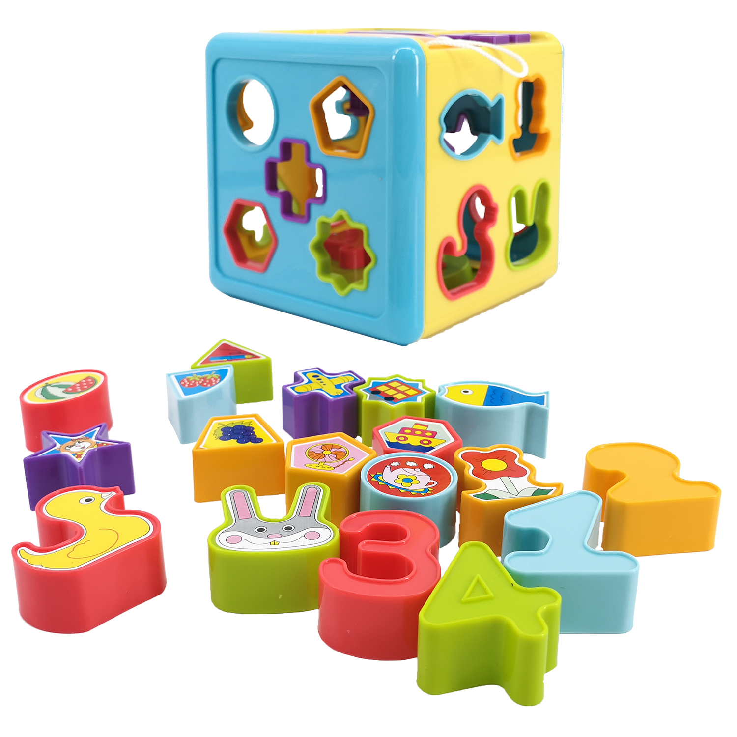 12М+.В стенках куба имеются отверстия разных форм. Задача малыша подобрать им соответствующие предметы. В наборе: 4 предмета с наклейками животных, 10 геометрических фигур с изображениями простых предметов, и 4 цифры.После того, как малыш поместил все формы в куб, их нужно достать.Поставив стрелки часов на 12, можно открыть крышку и достать фигуры. Кроме того, имеется телефонная трубка, издающая звук «бип». Рядом - кнопки от 1 до 4, при нажатии на которые выскакивает панель с мишкой.