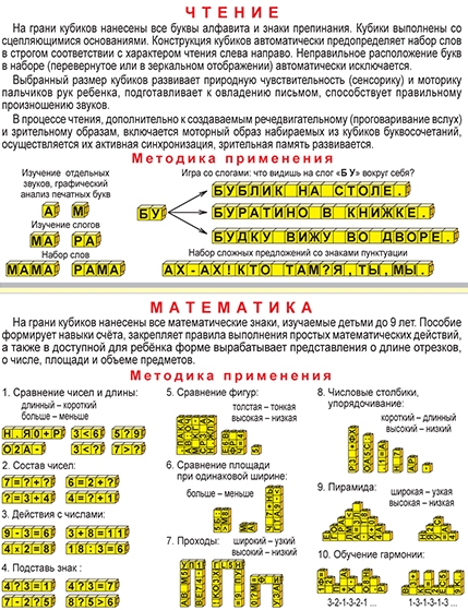 Пособие для игрового обучения счёту и чтению детей 3-9 лет. Методическое пособие в форме игры можно использовать дома, в детском саду, на развивающих занятиях, на уроках в школе по родной речи и математике. развивает зрительную память и моторику пальчиков ребёнка; формирует навыки счёта, закрепляет правила математических действий; вырабатывает правильную речь при складывании слов и предложений; исключает неправильный набор букв в словах; развивает интерес к чтению и счёту. Примеры занятий с использованием кубиков-блоков из набора: Складываем слова и составляем предложения. Решаем математические задачки. Развиваем зрительную память и моторику пальчиков ребёнка. Играем на занятиях в детском саду и школе, дома и в дороге. В комплекте: 36 кубиков со сцепляющимися основаниями, на которых 144 повторяющихся букв, цифр и знаков.