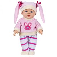 1+.Пупс Малышка в милом костюмчике с соской. Высота пупса - 30 см. Упаковка - лоток картонный. Материал: тело - ПВХ-пластизоль, одежда - текстильные синтетические материалы, комплектующие (соска) - пластик.
