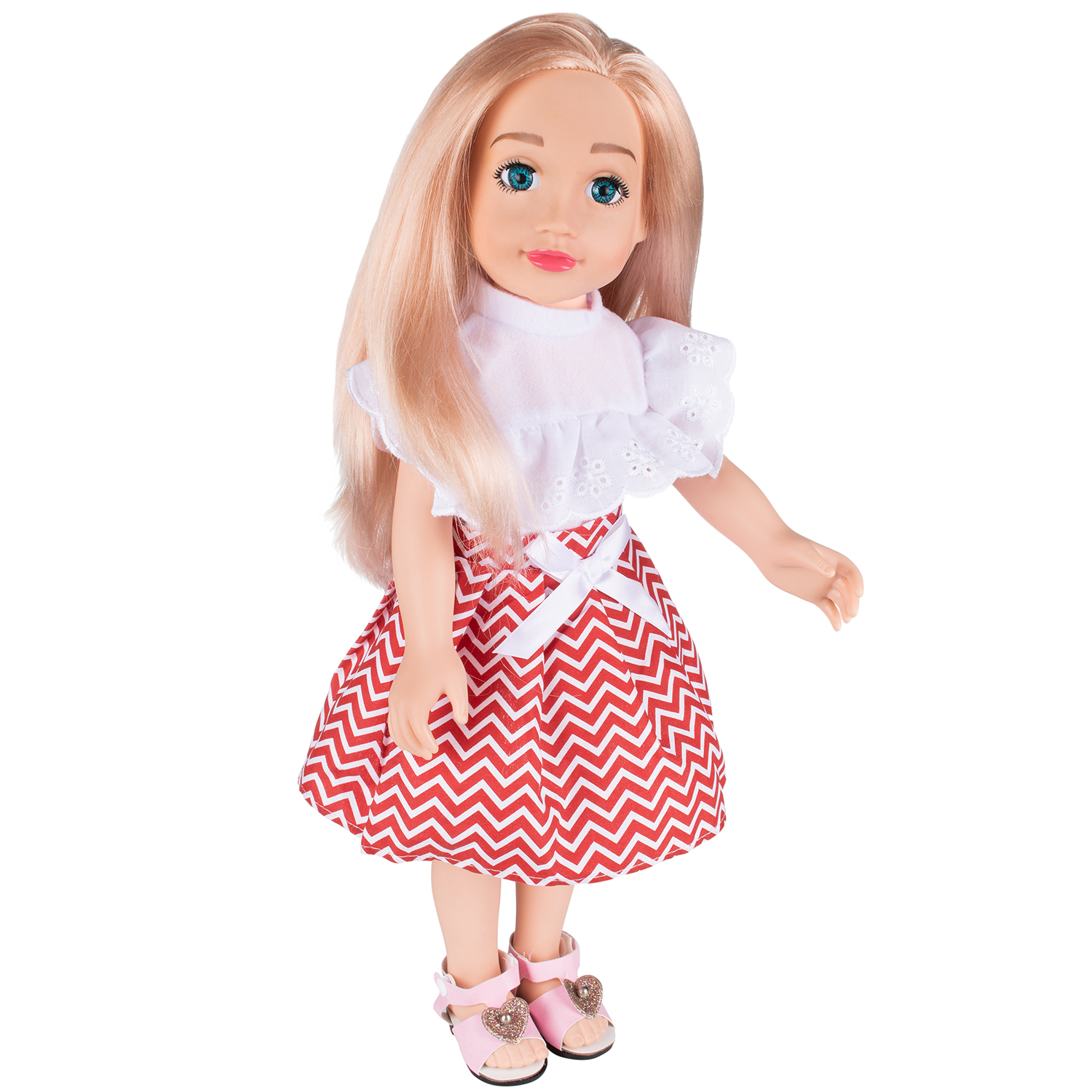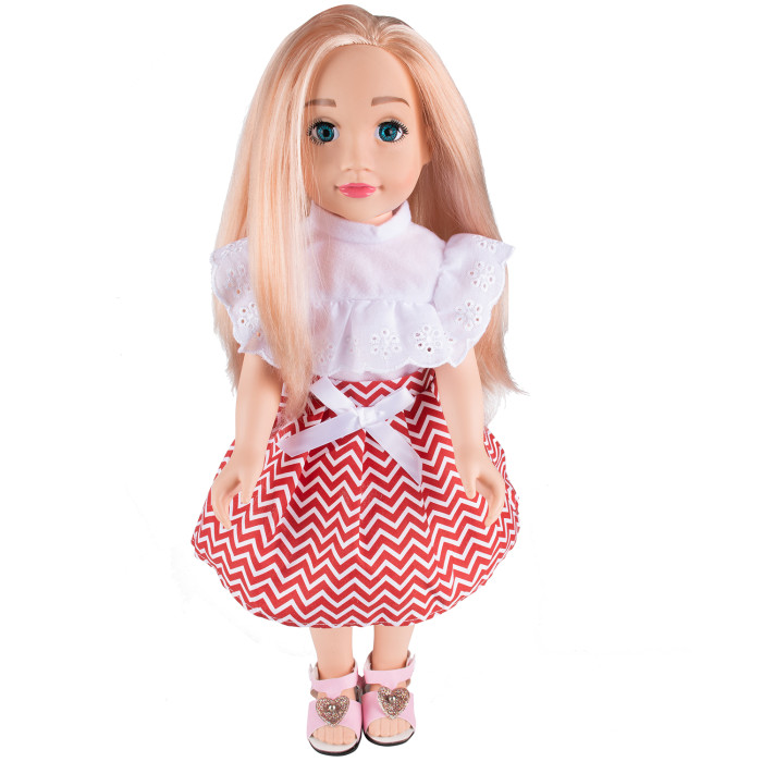 3+.Кукла София - любознательная подружка, с которой очень весело проводить вместе время дома: читать, рисовать, смотреть мультфильмы, открывать для себя каждый день что-то новое, придумать множество совместных сюжетно-ролевых игр. Например, можно сыграть в салон красоты. Потому что у Софии не только очаровательное милое личико с выразительными глазками, но и длинные густые светлые волосы, которые можно укладывать в самые различные прически: косички, хвостики, добавить аксессуаров и т.д. София никогда не даст скучать! Ее яркий комплект включает в себя белоснежную блузу с рюшами, пышную юбочку и босоножки с акцентом в виде блестящего сердечка. Куколка имеет отличную детализацию и подвижные части тела. Игры с куклами прививают девочке с ранних лет чувство заботы и опеки. Размер куклы: 45 см