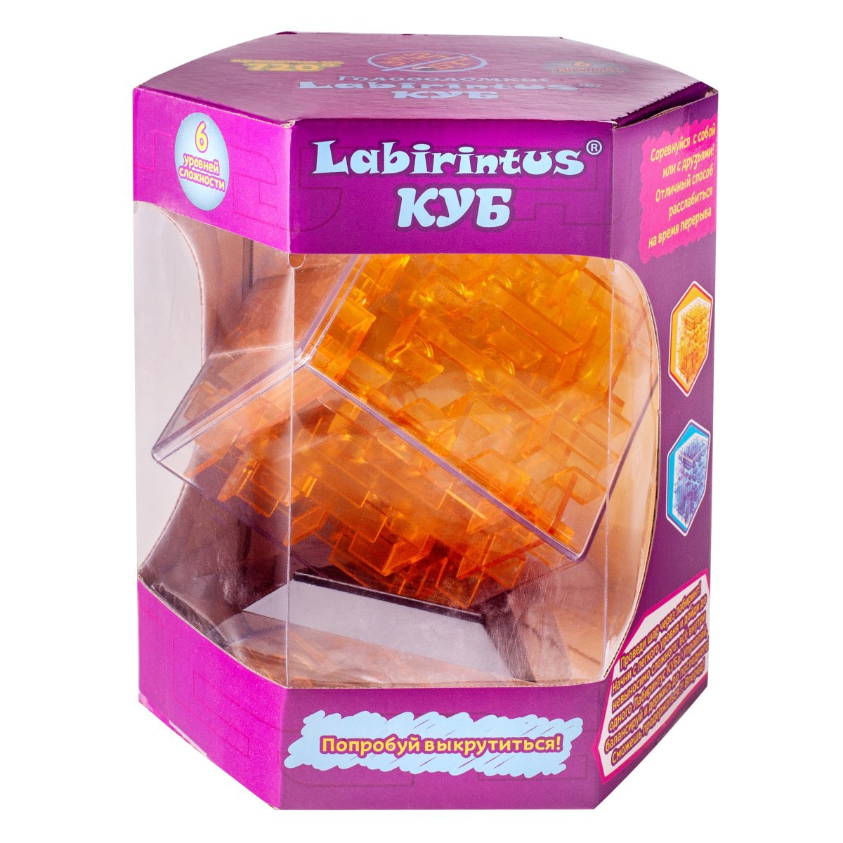 Лабиринт в форме куба 10х10х10см. Металлический шарик нужно провести по всем 6 сторонам от начала и до конца. Внутри куб пустой, все дорожки только на внешних сторонах. Стартовая точка обозначена на прозрачном корпусе игрушки выпуклым кружком, а финишная находится на противоположной стороне игрушки. Трасса разделена на 6 отрезков, соответствующих 6 уровням сложности - нужно пройти от 1 до 2, от 1 до 3 и т.д. до прохождения всей трассы от начала до финиша! На прохождение всей трассы в первый раз может уйти 2 часа - в лабиринте много коварных подвохов, тупиковых поворотов! Прозрачно-оранжевый цвет. Подставка-треугольник в комплекте.