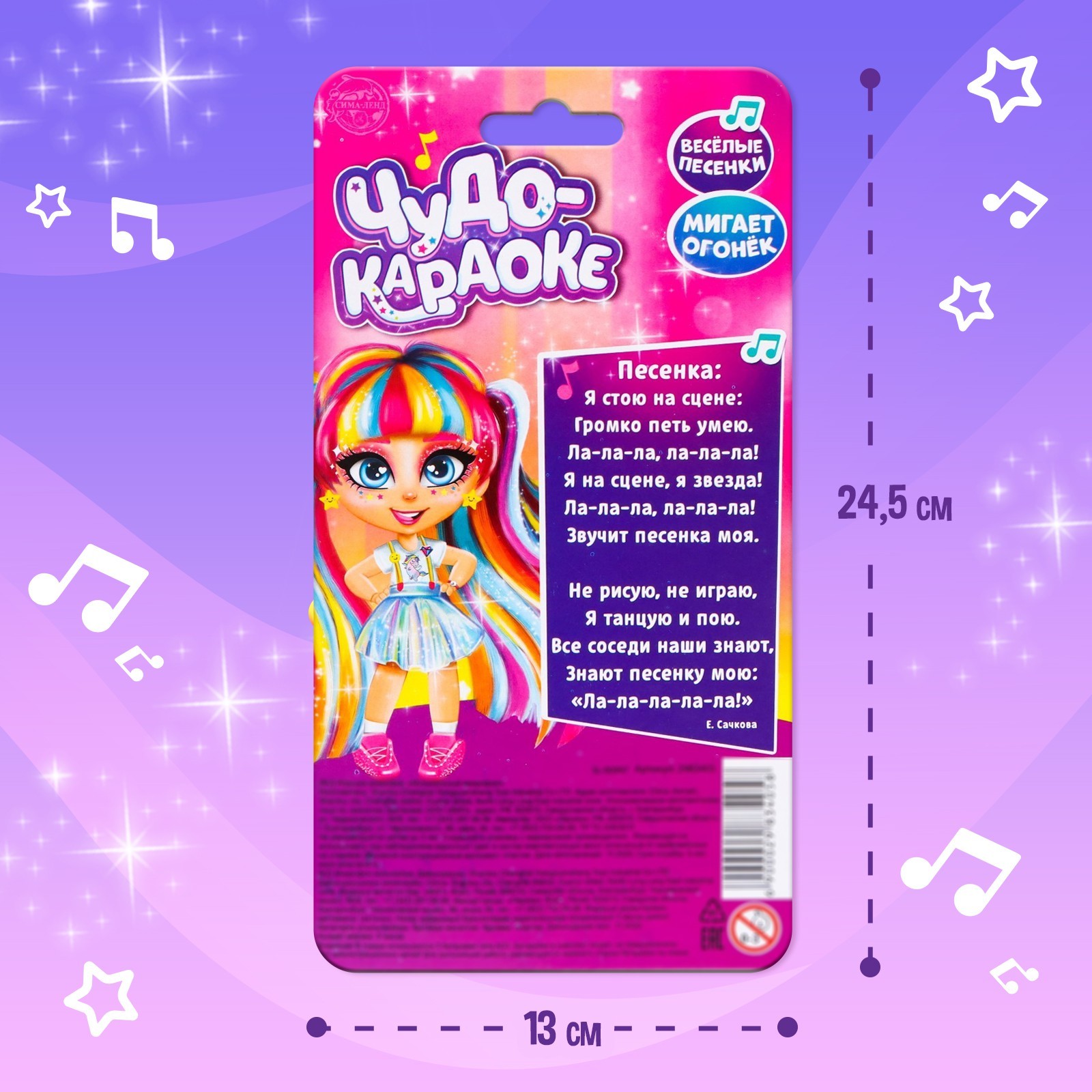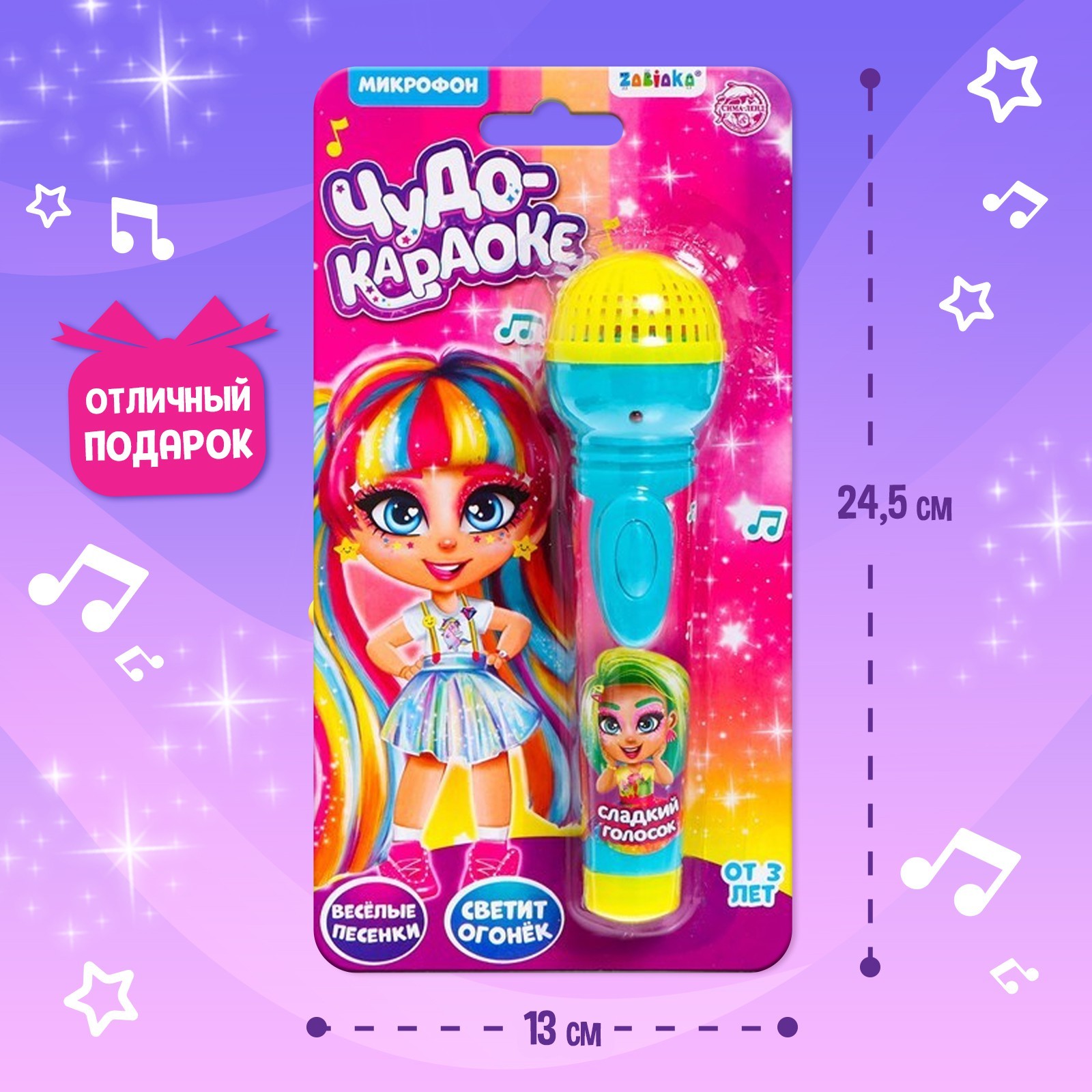 3+.Вместе с музыкальным микрофоном «Сладкий голосок» малышка почувствует себя настоящей артисткой! Ручной микрофон воспроизводит весёлые русские песенки. Также игрушка светится ярким огонёчком. Она очень удобная и компактная, поэтому можно устраивать концерты где угодно. Для помощи малышке текст одной из песенок напечатан на упаковке игрушки! Читайте слова и пойте вместе!