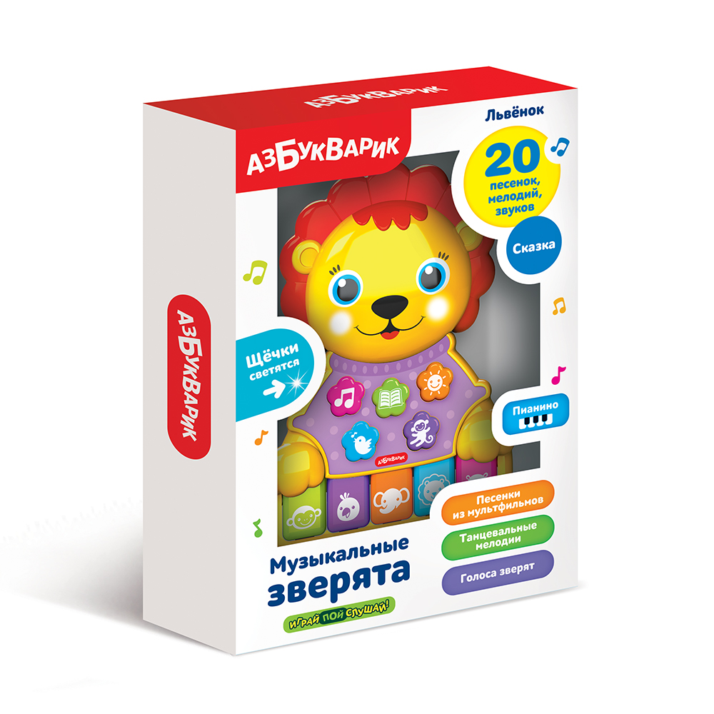 При нажатии на цветные клавиши ребенок сможет поиграть на пианино и послушать голоса зверят. У него получится настоящее синхронизированное светомузыкальное шоу. Ведь при проигрывании у музыкального плеера светятся щечки. Нажимая на фигурные кнопочки, малыш послушает сказку «Упрямый слоненок», забавные звуки и мелодии, обучающие песенки («Считалочка в зоопарке», «Весёлые противоположности», «Песенка про формы и цвета»). Львенок развивает сенсорику и моторику: яркие цвета, веселая музыка и различные текстуры стимулируют визуальные, слуховые и тактильные навыки ребенка. Кроме того, игрушка развивает память и речь. Порадуйте своего малыша Львенком из серии Музыкальных зверят. Этот детский плеер вовлечет ребенка в удивительный мир чисел, форм, цветов и противоположностей!