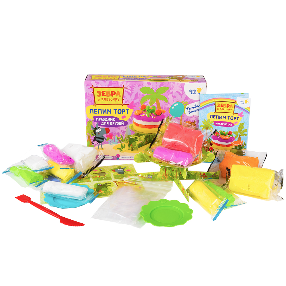 Легкий пластилин Genio kids – материал из которого хочется лепить са-а-амым разным ребятам: и шаловливым непоседам и примерным ученицам, и маленьким крохам и почти взрослым детям. А в компании с Зеброй в клеточку и её друзей лепить её веселее! В набор входят пакетики с легким пластилином, стек-нож, 2 тарелки, инструкция и заготовка для сборки подставки для торта.