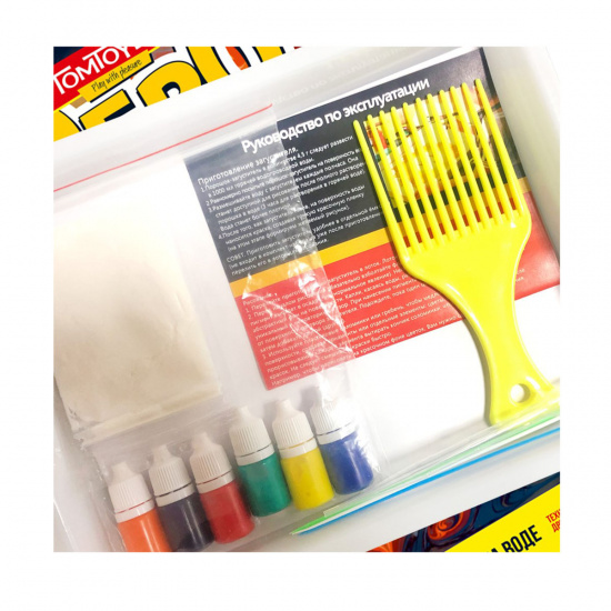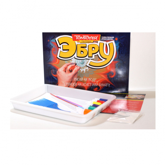 6+.Набор для рисования на воде «Эбру». Восточная техника рисования. Состав набора: пластиковый лоток (21,5 х 28 см), гребень с зубьями (16 х 6 см, зубья – 6,5 см), пипетка Пастера (15 см), листы – 10 шт. (17,5 х 23,5 см), пластиковые соломинки – 3 шт. (16 см), порошок-загуститель (2 гр), краски (фиолетовый, синий, красный, оранжевый, зелёный, жёлтый) – 6 шт. (7 мл. каждая), инструкция. Занятия с набором развивают творческие способности, усидчивость, тренируют аккуратность, внимательность, учат следовать инструкциям для достижения желаемого результата.