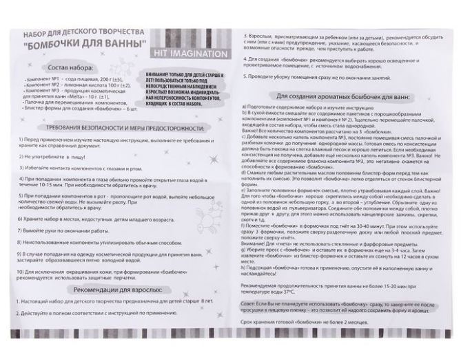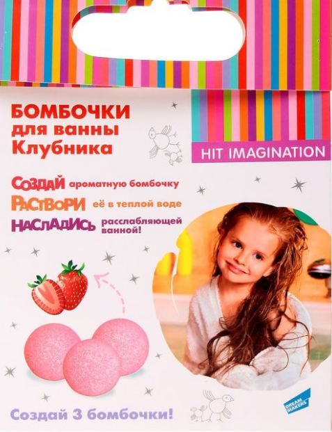 Набор для создания трех бомбочек для ванны с ароматом "клубника". Предназначен для детей старше 8 лет. В наборе: сода пищевая-200г , лимонная кислота-100г, полимерная блистер-форма- 6 шт, продукция косметическая для принятия ванн "Melta"- 10мл, пластмассовая палочка- 1шт. , инструкция- 1шт.