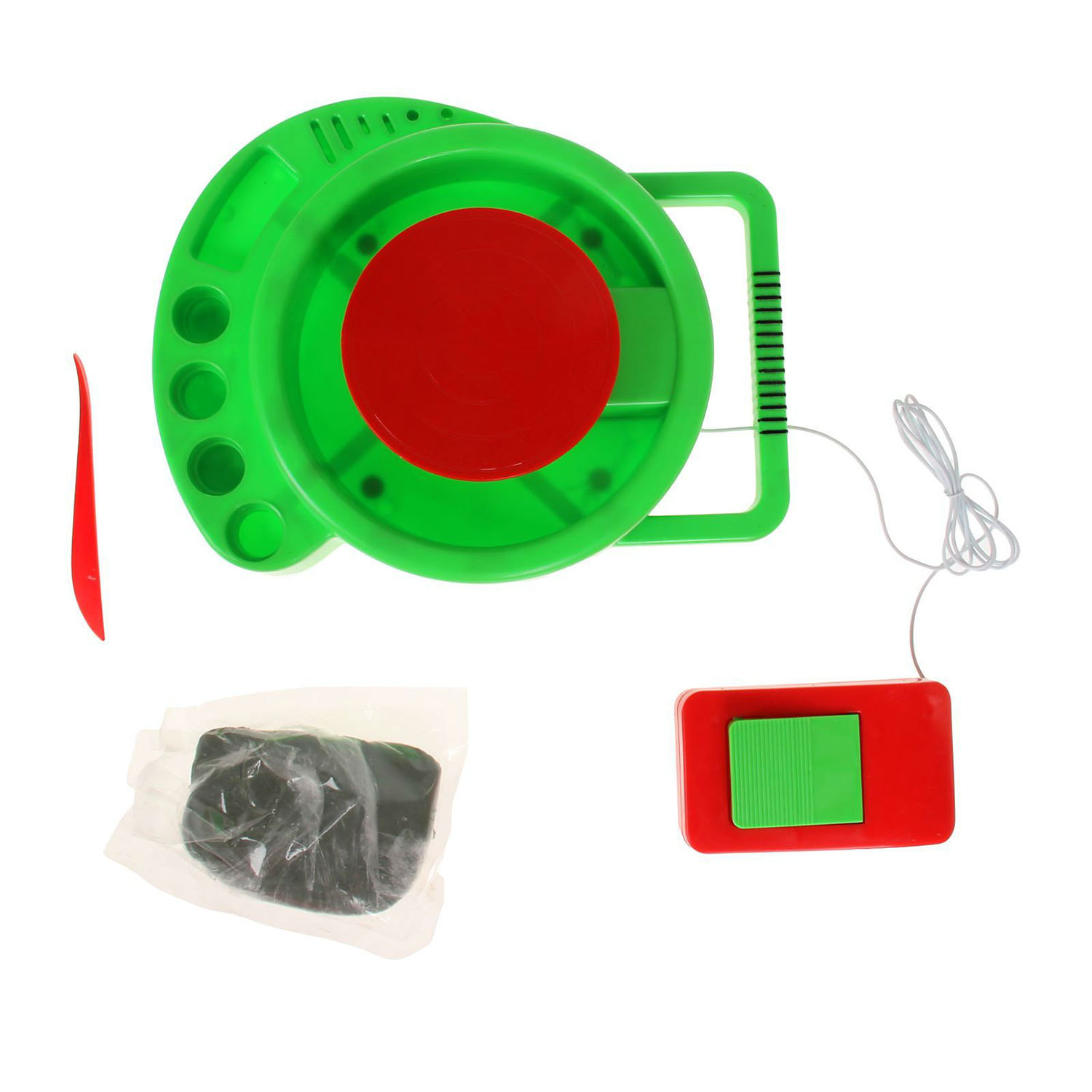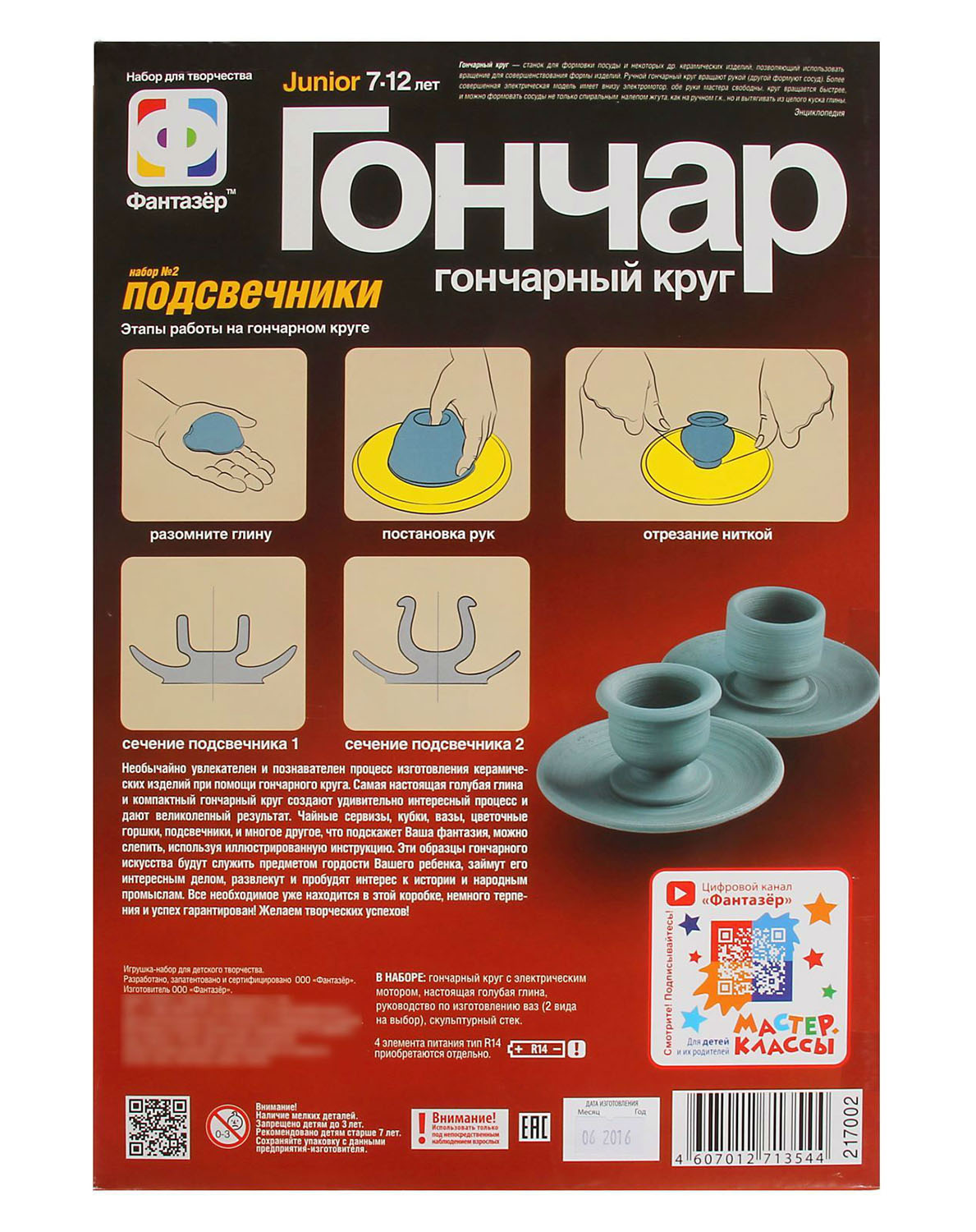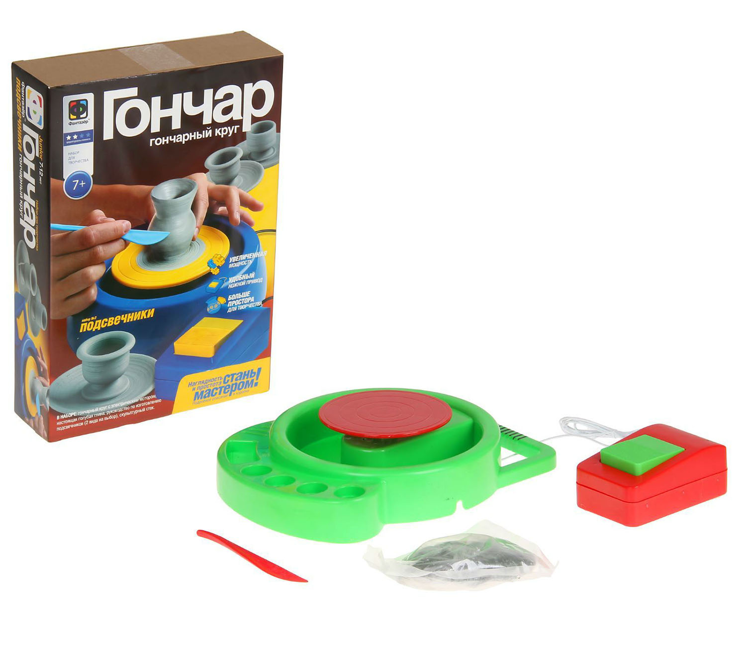 7+.Необычайно увлекателен и познавателен процесс изготовления керамических изделий при помощи гончарного круга. Самая настоящая голубая глина и компактный гончарный круг создают удивительно интересный процесс и дают великолепный результат. Чайные сервизы, кубки, вазы, цветочные горшки, подсвечники и многое другое, что подскажет Ваша фантазия, можно слепить, используя иллюстрированную инструкцию. Эти образцы гончарного искусства будут служить предметом гордости Вашего ребенка, займут его интересным делом, развлекут и пробудят интерес к истории и народным промыслам. Комплектация Гончарный круг с электрическим мотором, голубая глина, скульптурная стека, руководство по использованию