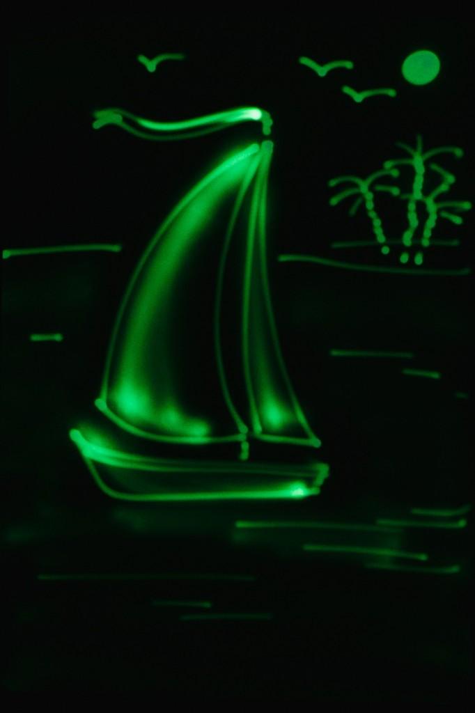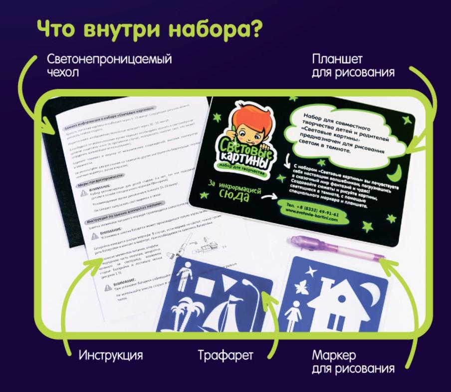 Набор для творчества "Рисуй светом" позволяет создавать удивительные световые картины. Рисовать на планшете, покрытом фотолюминесцентной пленкой, необходимо при помощи специального маркера со светящимся наконечником. Изображение получается очень ярким, причем чем темнее в помещении, тем ярче выходит картинка. Начинающие художники могут рисовать при помощи разнообразных трафаретов, которые также входят в комплект. Возраст: от 3 лет Комплект: планшет, чехол, маркер, 2 трафарета, инструкция. Из чего сделана игрушка (состав): пластик, пленка ПВХ, пленка фотолюминесцентная.