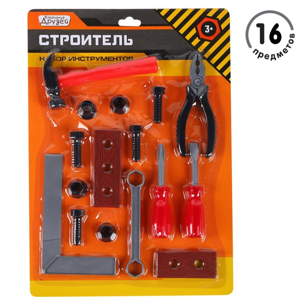3+.Игровой набор инструментов «Строитель» от ТМ «Компания друзей» понравится каждому ребенку. С этим набором юный строитель попробует себя в роли настоящего мастера: в процессе игры будет учиться закручивать гайки и забивать гвозди, мастерить и чинить. Набор инструментов поможет развитию мелкой моторики, а также мышления и самостоятельности. Игра в строителя сформирует у ребенка любовь к труду и работе руками. В наборе 16 предметов. Все изделия выполнены из нетоксичного пластика и безопасны для детского здоровья. С этим набором юный строитель попробует себя в роли настоящего мастера: в процессе игры будет учиться закручивать гайки и забивать гвозди, мастерить и чинить.