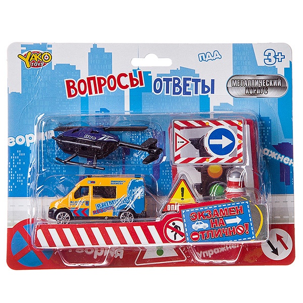 В набор входит 2 металл. машинки и 6 карточек на знание дорожных знаков, для "сдачи экзамена по теории". На фронтальной стороне карточки – изображение дорожного знака На оборотной стороне карточки – ответ.
