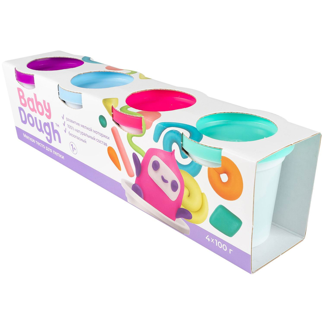 1+.В наборе 4 цвета мягкого теста для лепки: синий, нежно-зеленый, красный, оранжевый. Экологичный бренд, в котором натуральный состав (пищевые красители), высокое качество теста для лепки. Можно использовать дополнительные цвета из наборов Baby dough для создания ярких и смелых шедевров.