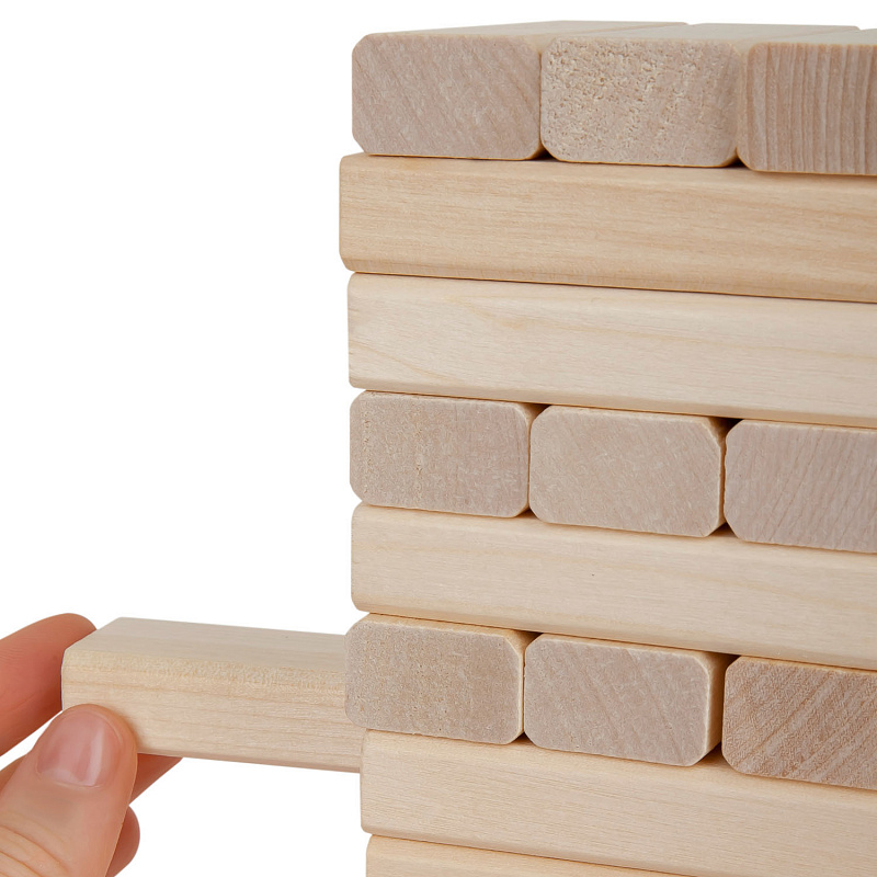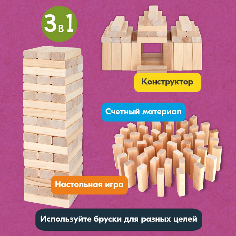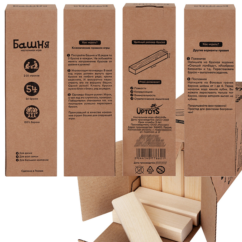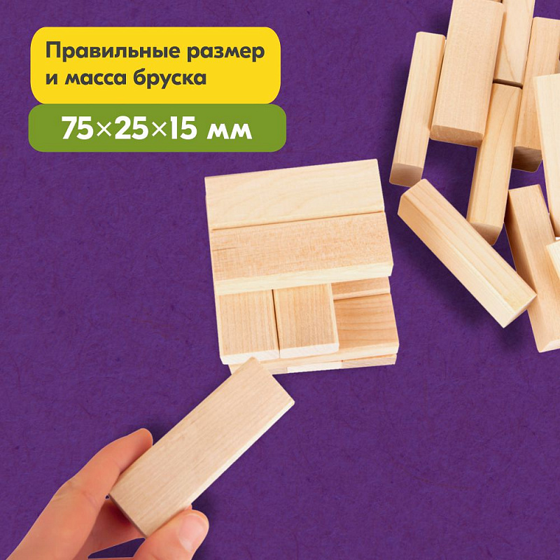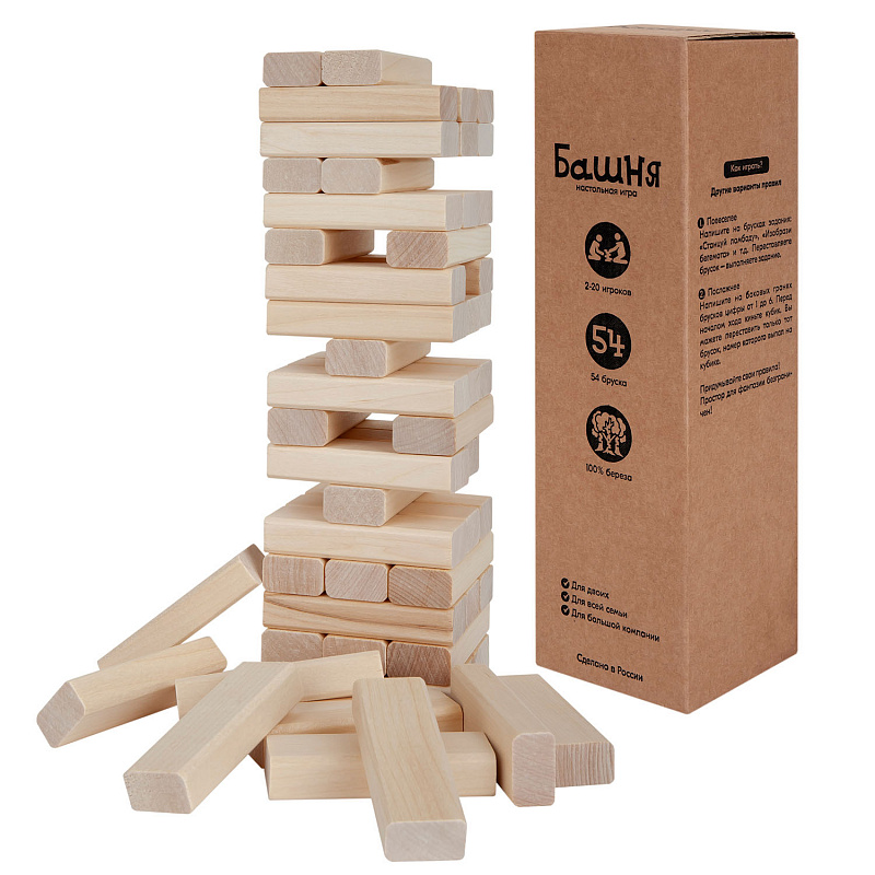 3+.Веселая и динамичная настольная игра Башня (она же Падающая Башня, Дженга, Джанга, Jenga) — это увлекательная игра, известная еще с середины прошлого века. Цель игры: переставляя один брусок, не уронить всю башню. Важны баланс и координация, а еще стратегия — чтобы предугадать, какой именно кирпичик может привести к падению крепости. Полезно для детей 3, 5, 7, 10 лет, подростков, школьников и взрослых от 18 лет. Подходит для большой и маленькой компании, пары. Развивающая игрушка из натурального дерева (100% береза) для всей семьи. Отличный подарок на любой праздник. Универсальна игра на любой возраст: для детских праздников, для семейного отдыха, для вечеринки, для большой компании. Игра развивает ловкость, внимательность, стратегическое мышление, координацию. Высота башни в начале игры: 27см.