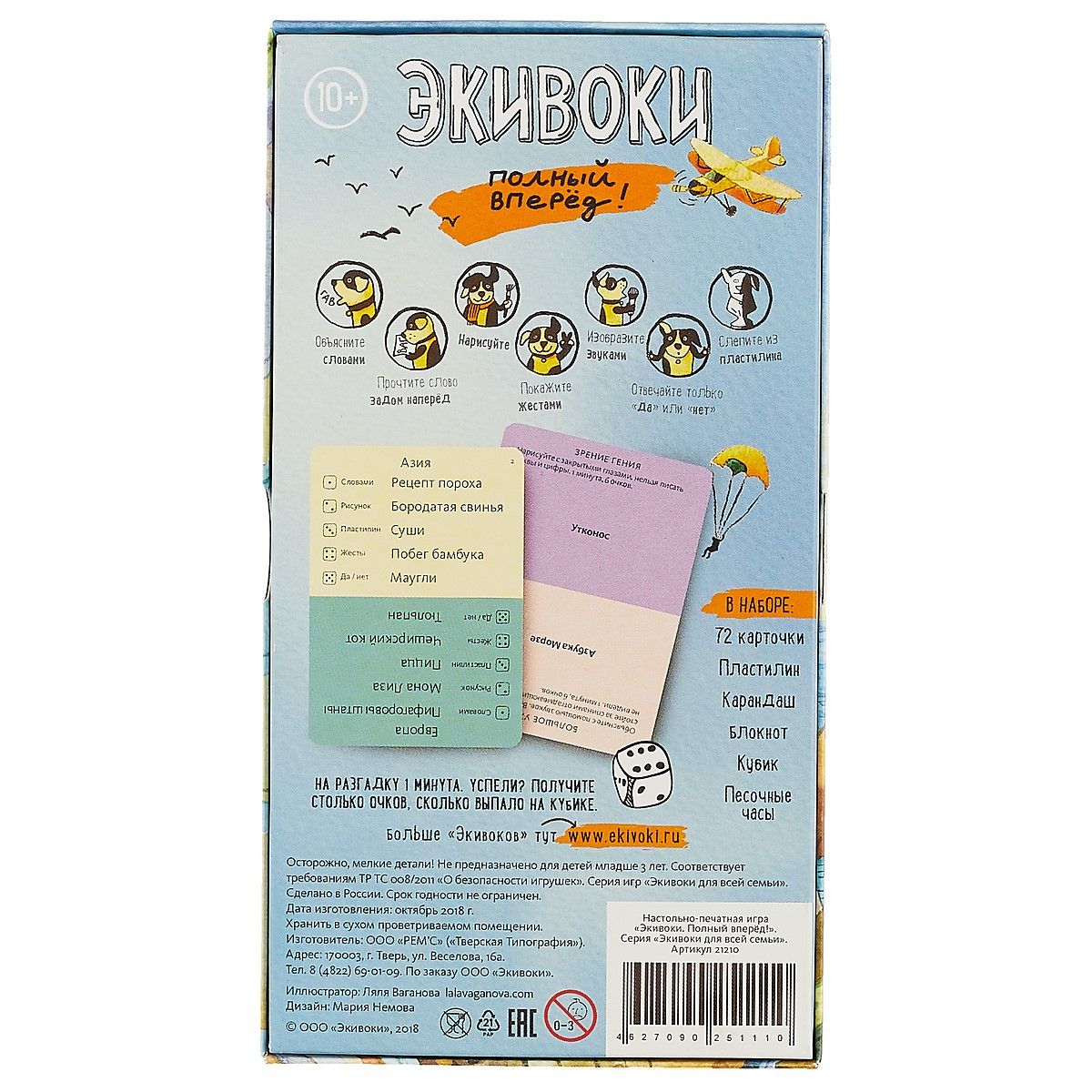 10+.Правила очень просты: взять карточку и объяснить другим игрокам указанный на ней предмет или явление, не говоря об этом прямо. Придется объяснять звуками, показывать пантомиму, рисовать, лепить из пластилина, читать задом наперед. Вы откроете массу талантов у себя и друзей! «Экивоки. Полный вперед !» особенно порадует тех, кто любит путешествовать с детьми или компанией друзей. Заданий столько, что хватит на полёт от Москвы до Рио-де-Жанейро! Коробочка карманного размера содержит 72 карточки с заданиями и все необходимое для игры. В этой версии нет игрового поля, вместо него блокнот для подсчета очков. Играть можно компанией или вдвоем, а если желающих много – разделившись на команды. Игра подходит для 2-16 игроков. Продолжительность партии 20-60 минут.