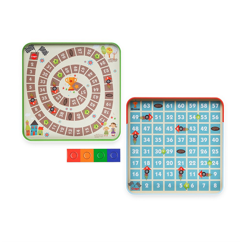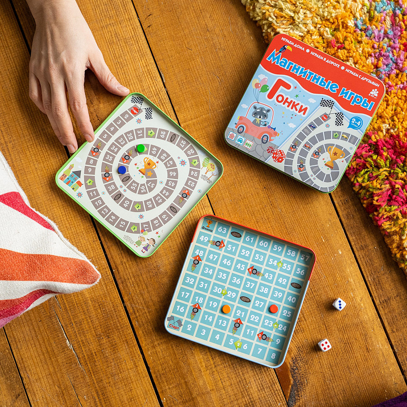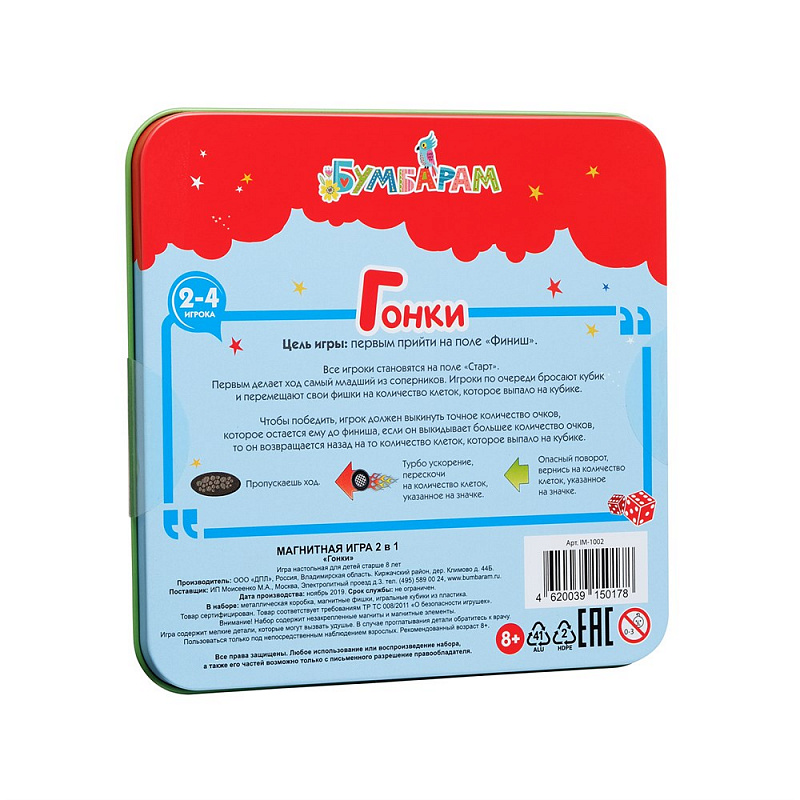 8+.Динамичная настольная игра, в которой скорость имеет значение. В игре есть 2 гоночных трека на выбор - Спираль и Поле 8х8. Только самый смелый и удачливый приедет к финишу первым. Игра идеально подходит для детей, так как у нее простые правила и быстрый игровой процесс. Сочетая Гонки с другими играми серии, вы сможете собрать свою уникальную коллекцию развлечений. Цель игры: первым прийти на поле "Финиш". Правила игры. Игроки выбирают цвет своей фишки и по очереди кидают кубик. Первым ходит самый младший игрок. Фишка перемещается на количество клеток, которое выпадает на игровом кубике, если игрок попадает на специальные поля, то он выполняет действие (пропуск хода, турбо-ускорение, возврат на несколько шагов). Победителем становится игрок, чья фишка первой попадет на поле "Финиш". При этом, важно точно попасть на клетку Финиш, выкинув на кубике точное количество очков для попадания на Финиш. Если на кубике окажется больше очков, чем нужно для попадания на поле "Финиш", то игрок возвращается назад на то количество шагов, которое выпало на кубике. Игра из серии "Магнитные игры" от Бумбарам (Россия). Эти игры отличает качественное исполнение, яркий дизайн. В серию вошли самые популярные настольные игры в мире. Испытайте свои силы, учитесь мыслить стратегически, состязайтесь с другими противниками и с самой фортуной! Все наши игры снабжены фишками на магнитах и компактным игровым полем, так что их можно и нужно брать в дорогу. Компактная настольная логическая игра в дорогу. В комплекте: металлическая коробка с 2 магнитными полями - "спираль 58 шагов" на крышке и поле 8х8=64 шага на дне, 4 магнитные фишки разного цвета ∅1см, игральный кубик 1х1см. Количество игроков: 2-4