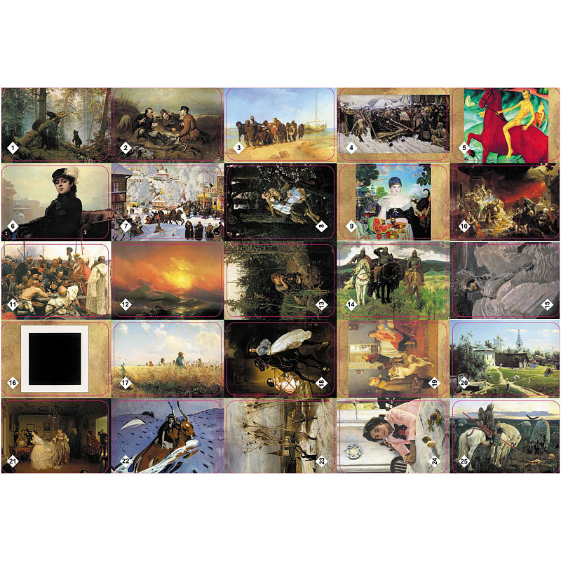 У вас в руках новая игра из серии "Мемо" - "Картины русских художников". "Мемо" - игра действительно интересная и удивительно полезная! Она с лёгкостью поднимет настроение большой и маленькой компании. Вы станете поклонником этой игры, попробовав сыграть лишь однажды. "Мемо" - одна из тех редких игр, где успех чаще зависит от способностей и стараний игрока, чем от удачи. "Мемо" - полезная игра с простыми правилами, где дети могут выиграть без "поддавков" у взрослых! Игра состоит из карточек с парными изображениями. Всего 25 пар (50 карточек). Вы и не заметите, как запомните всё, что изображено на карточках. Это игра, безусловно, расширяет кругозор, развивает внимание, тренирует память. Все картины, представленные в нашей игре - это величайшие произведения искусства, хранящиеся в Государственном Русском музее в Санкт-Петербурге и Государственной Третьяковской галерее в Москве. В комплекте вы найдете буклет с их кратким описанием. А может быть, вы захотите всей семьёй воочию увидеть эти произведения искусства? Даже если вы живёте в небольшом городе, наверняка у вас есть свой музей, где представлены уникальные памятники искусства. Загляните туда. А с нашей игрой отправляйтесь в виртуальный тур по залам двух самых известных хранилищ художественных ценностей. И, наконец, "Мемо" - это всегда хороший подарок, который одинаково подходит как для мальчиков, так и для девочек. Правила игры: Эта игра поможет вам развить вашу память. Вам необходимо собрать как можно больше пар карточек, т.е. две карточки с одинаковой картинкой. Разложите карточки на столе картинками вниз. Начинает игру самый младший игрок и ход переходит по часовой стрелке. Игроки по очереди переворачивают по две карточки таким образом, чтобы все могли видеть изображенные на них картинки. Если картинки на карточках одинаковые, то игрок забирает их. Он может продолжать игру до тех пор, пока он находит карточки с одинаковыми картинками. Если картинки на карточках не совпадают, то игрок кладёт карточки обратно картинками вниз и ход переходит к следующему игроку, сидящему слева. Выигрывает тот игрок, который к концу игры наберет большее количество парных карточек. Возраст: 5+.