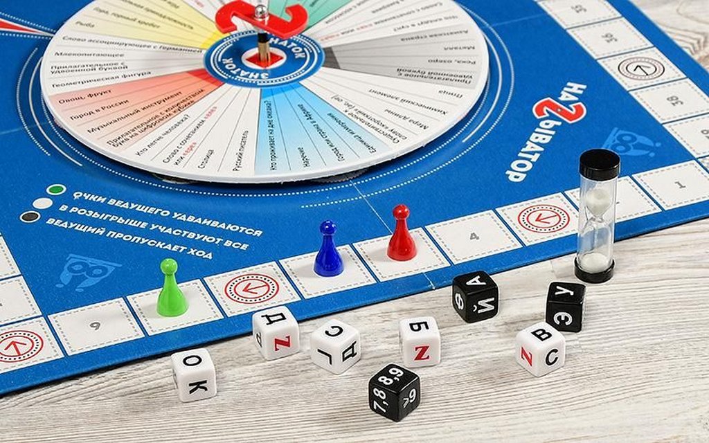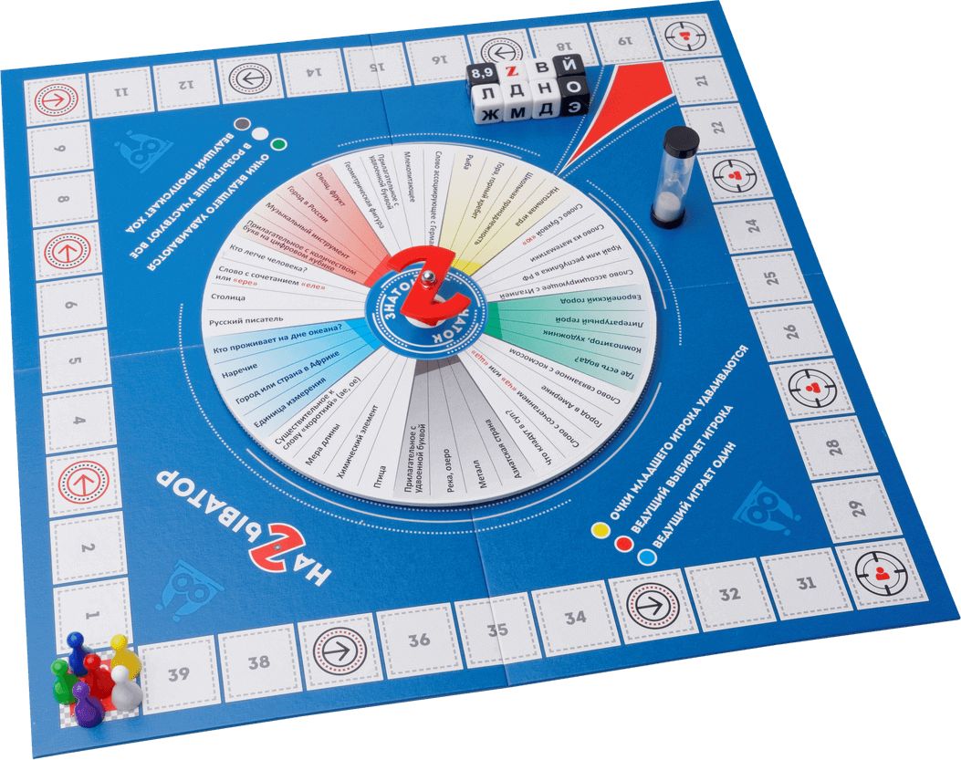 12+.«Называтор» от ИнтерХит – уникальная серия игр: весёлая, динамичная и оригинальная. Сразись с друзьями, сделай ставку на фантазию и интеллект, не забудь о везении и приди на финиш «Называтора» первым! Для яркого и весёлого вечера у тебя есть: • Игровое поле – основная задача игры как раз в том, чтобы первым дойти от старта до финиша; • Уникальный диск «Называтор» - он ставится на поле, вращается и определяет весь ход игры; • 8 кубиков: 7 с буквами русского алфавита (и джокером Z), один с цифрами; • Песочные часы; • Игровые фишки. Всё очень просто: фиксируете диск с механизмом на игровом поле, ставите фишки на старт, желаете друг другу удачи и вращаете диск «Называтора». Когда диск остановится, стрелка укажет на одну из тем (всего их 80, по 40 на каждой стороне диска) – например, «Что можно увидеть на концерте?». Теперь бросаем кубики: выпадет 7 букв и цифра. Твоя задача: быстро придумать слово, которое соответствует тематике и начинается с одной из выпавших букв. Придумал, назвал, забрал кубик себе. Диски «Называтора» заслуживают особое внимание: Во-первых, они двухсторонние. Если Вам надоели темы на одной стороне, просто переворачиваете и играете в новые! Во-вторых, диски всех игр серии подходят ко всем игровым полям «Называтора». Один раз купив игру, Вы можете в дальнейшем просто докупать диски и получать новые игры с совершенно новыми тематиками!