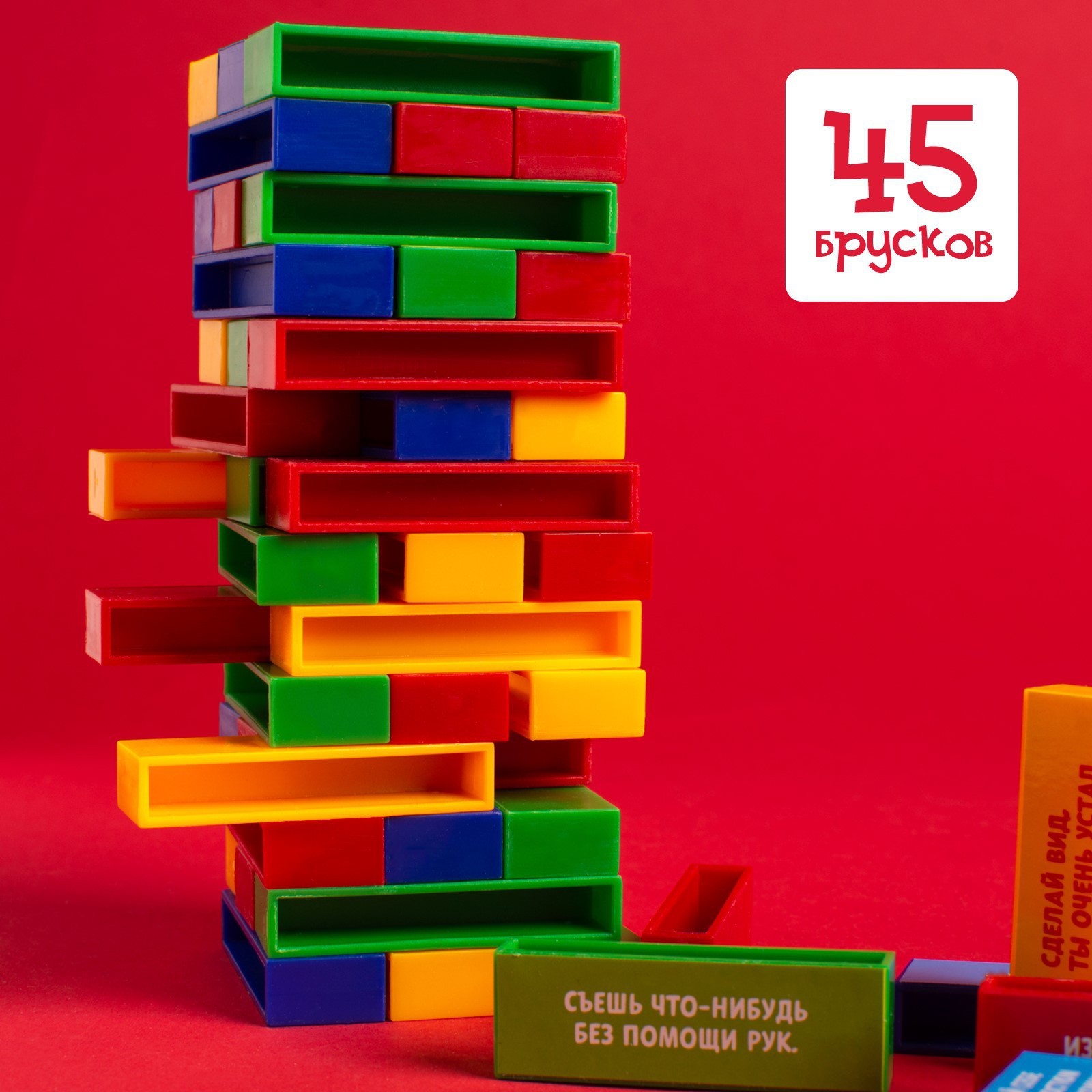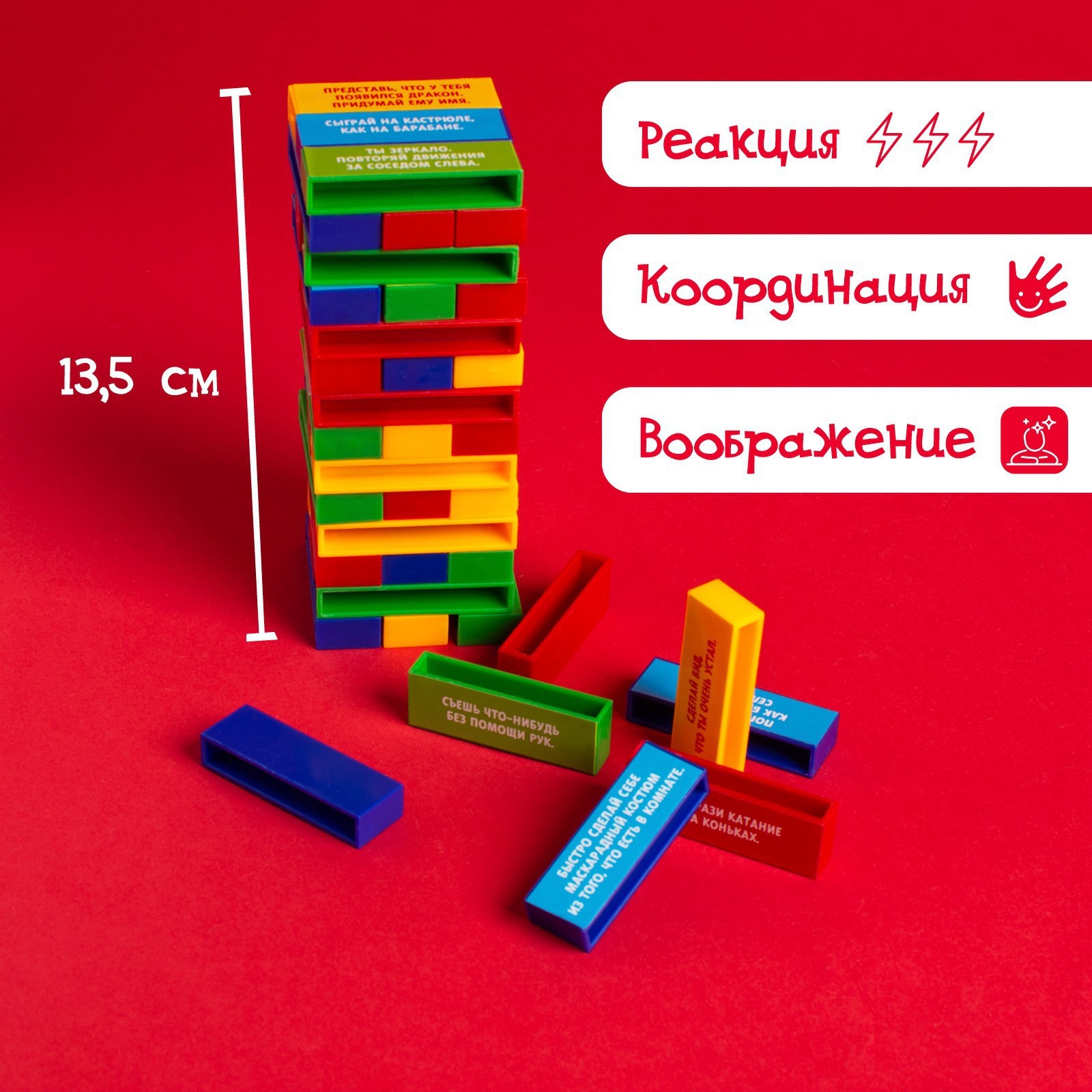 7+.Теперь всемирно известная и всеми любимая игра стала ещё интереснее! Теперь в процессе игры можно развивать не только реакцию и координацию, но и воображение. Тяните брусок и выполняйте весёлое задание, которое на нём написано. Игра закончится, когда башня упадёт. Идеально для шумных детских праздников!