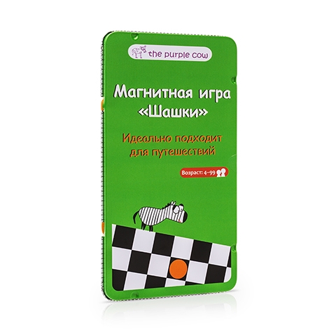 Игра настольная для путешествий. Настольная игра для двух игроков на доске, аналогичной шахматной, специальными магнитными фишками. Правила игры: Каждый игрок берет 12 цветных магнитиков (красных или зеленых). Доска размещается так, чтобы у каждого игрока в правом нижнем углу доски была белая клетка. Игроки располагают 12 шашек на черных клетках первых трех рядов. Затем игроки определяют, чей ход первый. Шашки можно ставить только на черные клетки, они могут ходить только по диагонали. Ходить можно только вперед, навстречу шашкам соперника. Шашка, которая не "рубит" шашку соперника (то есть ее ход не предполагает прыжок через клетку) может ходить только на одну клетку по диагонали. "Побить" шашку противника можно, перепрыгнув через нее и встав на следующую за ней пустую клетку. После этого шашка противника удаляется с доски. Если вы можете "срубить" шашку, вы должны это сделать. Одна и та же шашка может "срубить" несколько шашек, перепрыгивая через них на свободные клетки. Во время таких прыжков можно менять направление. Через свои шашки прыгать нельзя. Если у вас есть возможность нескольких ходов со "съедением" шашек соперника, вы можете выбрать любой из вариантов. Шашка, которая дошла до противоположного края доски (первого ряда соперника), становится дамкой. Дамка может ходить по диагонали на любое число клеток, причем как вперед, так и назад. Игрок побеждает в том случае, если соперник не может сделать ход, или "съедены" все шашки противника. Состав игры: металлическая коробочка - игральная доска, 28 магнитных элементов. Для детей от 4-х лет, удобно взять с собой в дорогу, в комплекте магнитные элементы, игра полностью адаптирована для России. Не рекомендуется детям до 3-х лет. Содержит мелкие детали.