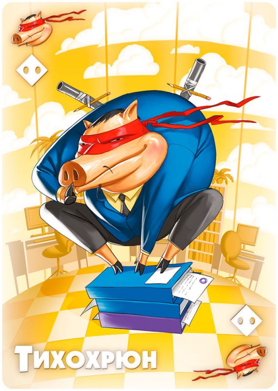 5+.Свинтус – юмористическая настольная игра, столкнет Ваших коллег в шуточном бою за победу. Суть игры - как можно быстрее скинуть все карты. Остальные игроки всячески Вам мешают это сделать. Для того чтобы начать игру необходимо тщательно перемешать карты и раздать каждому из играющих по восемь карт. Игрок, который сидит слева от раздающего, начинает игру и переворачивает из колоды верхнюю карту. Следующему игроку необходимо положить на перевернутую карту одну из тех, которые есть у него в руке таким образом, чтобы она совпадала с предыдущей по цвету или значению, либо воспользоваться специальной картой. Так по кругу поступают все игроки. Если игрок не может сыграть карту из руки, ему необходимо взять одну из колоды. Если та подходит, ее можно сыграть, если нет, то положить ее в руку и пропустить ход. Главная задача игроков - первым скинуть все карты из руки. Игра Свинтус очень динамичная и непредсказуемая. Невозможно предугадать развитие событий и выстроить стратегию.