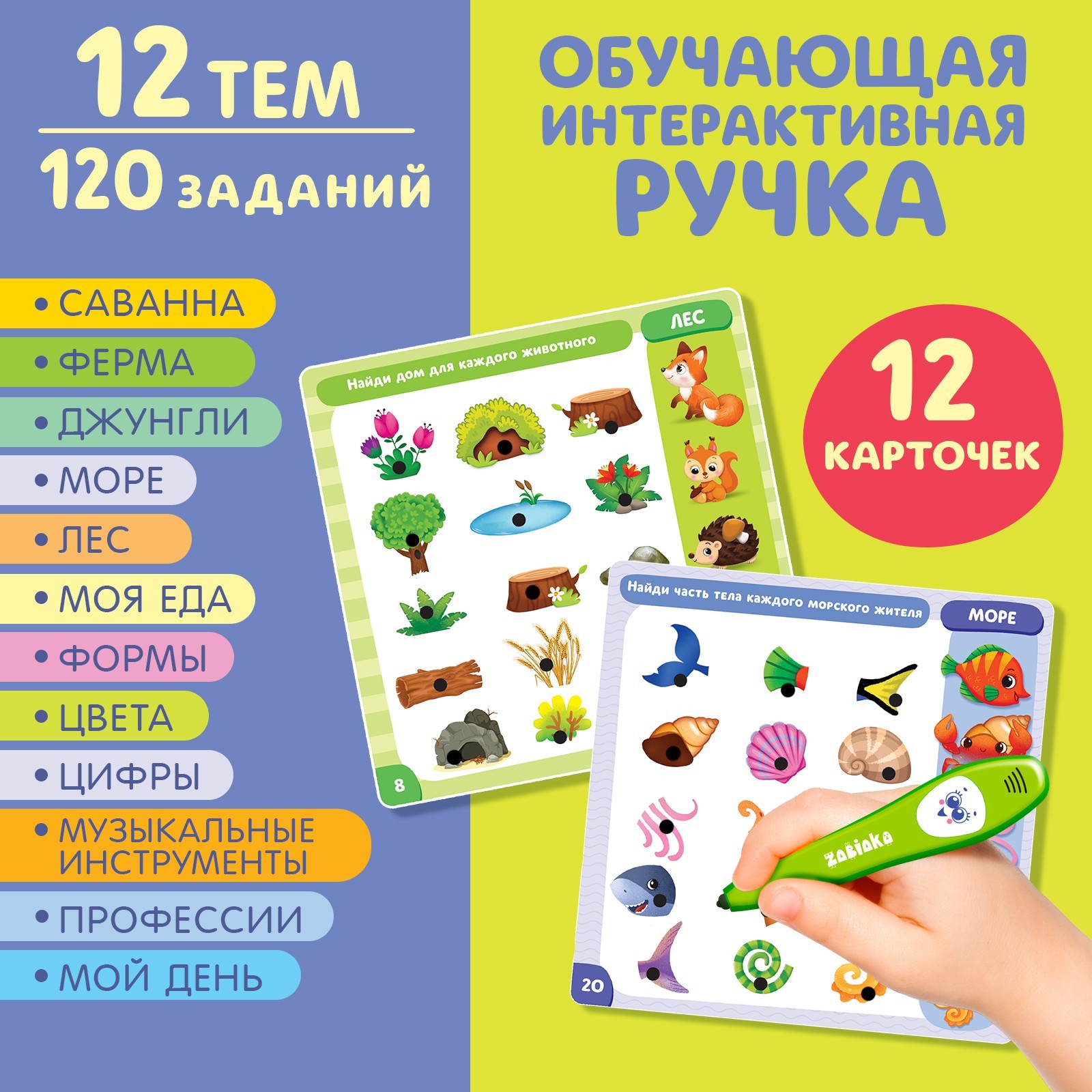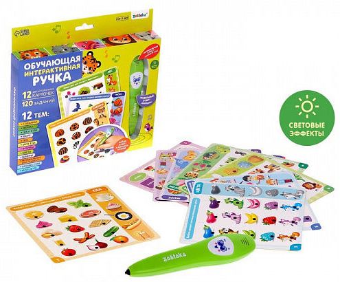 Обучающая игрушка «Умная ручка» разовьёт визуальное восприятие, мышление и память. С умной игрушкой ребёнок откроет много нового и интересного про животный мир, профессии, формы и многое другое! Также малыш научится правильно держать ручку в руке. В набор входит 12 двухсторонних обучающих карточек. На них малыша ждёт 120 заданий. Каждая карточка посвящена одной определённой теме. На каждой карточке 10 заданий, по 5 на каждой стороне. Карточка делится на 2 поля: поле заданий и поле ответов. Читайте задание и ищите правильный ответ в строчке по горизонтали. Ручкой коснитесь черного кружка на выбранном ответе – вы услышите, правильно ответили, или нет. 12 тем: саванна, ферма, джунгли, море, лес, моя еда, формы, цвета, цифры, музыкальные инструменты, профессии, мой день. Размер карточек: 16,5х16,5 см.
