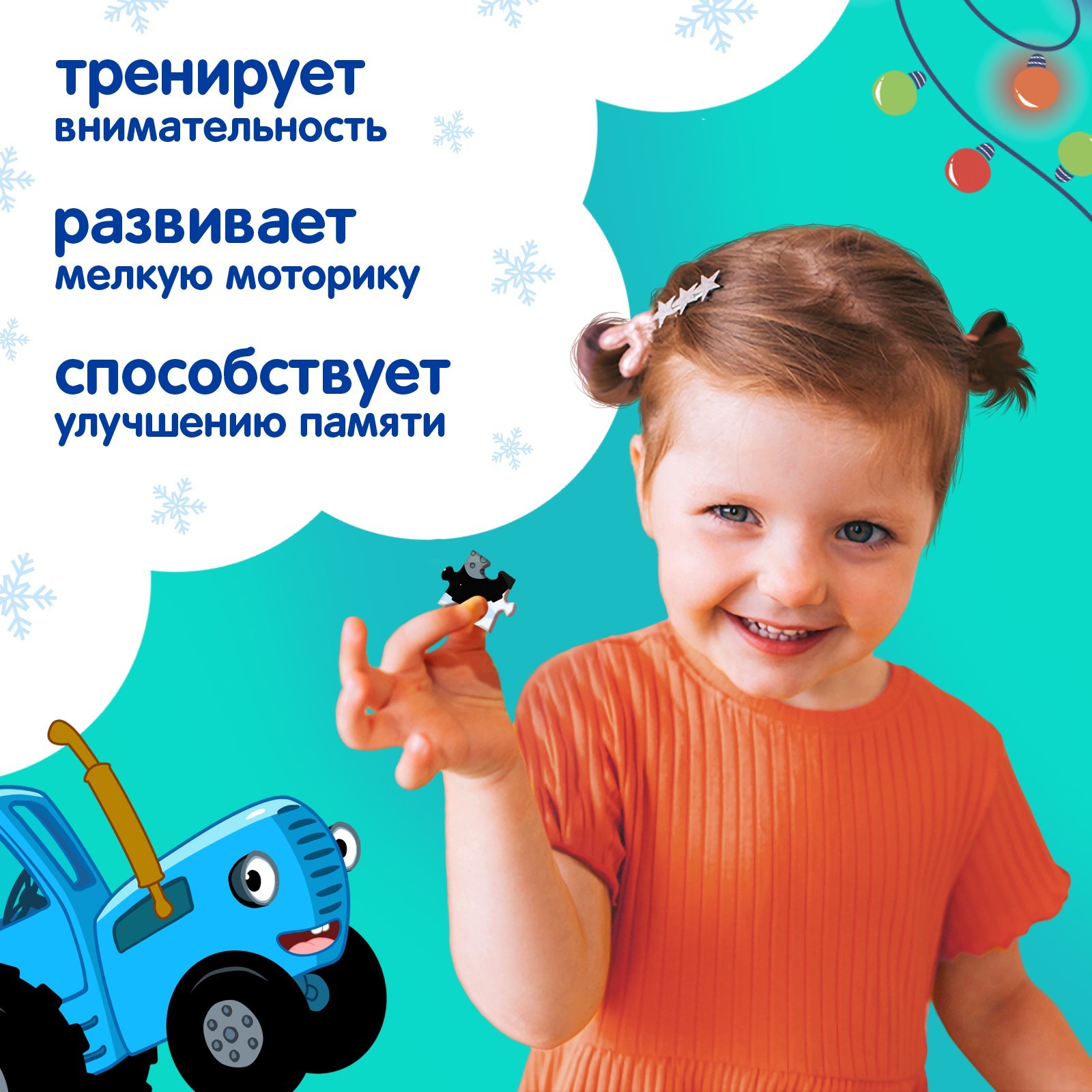 3+.Пазлы для малышей Синий трактор "Синий трактор: Новый год в городе" - это захватывающая игра, специально разработанная для детей младшего возраста. Набор состоит из 54 элементов, которые нужно правильно соединить, чтобы получилась полная картинка с изображением Синего трактора и новогоднего города.