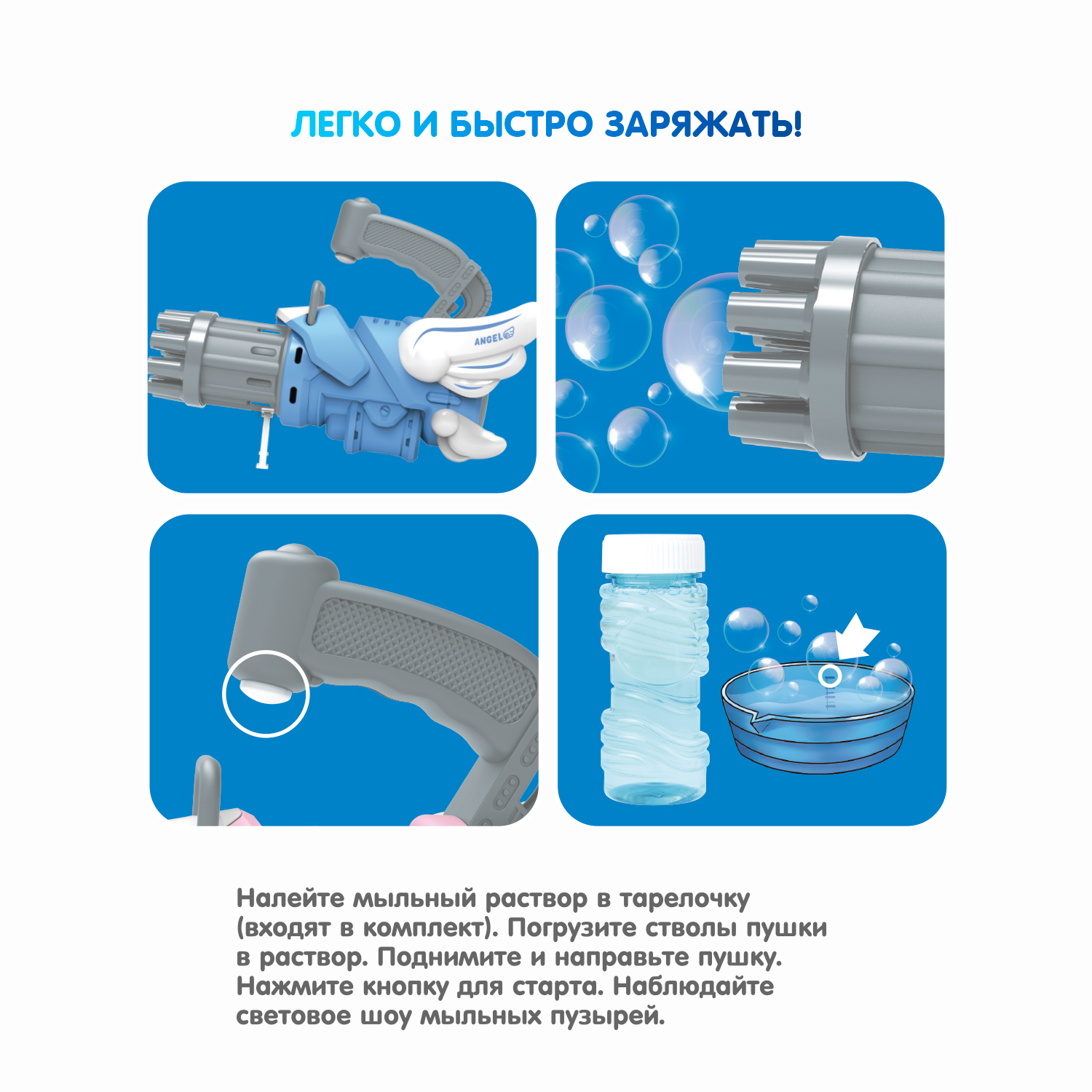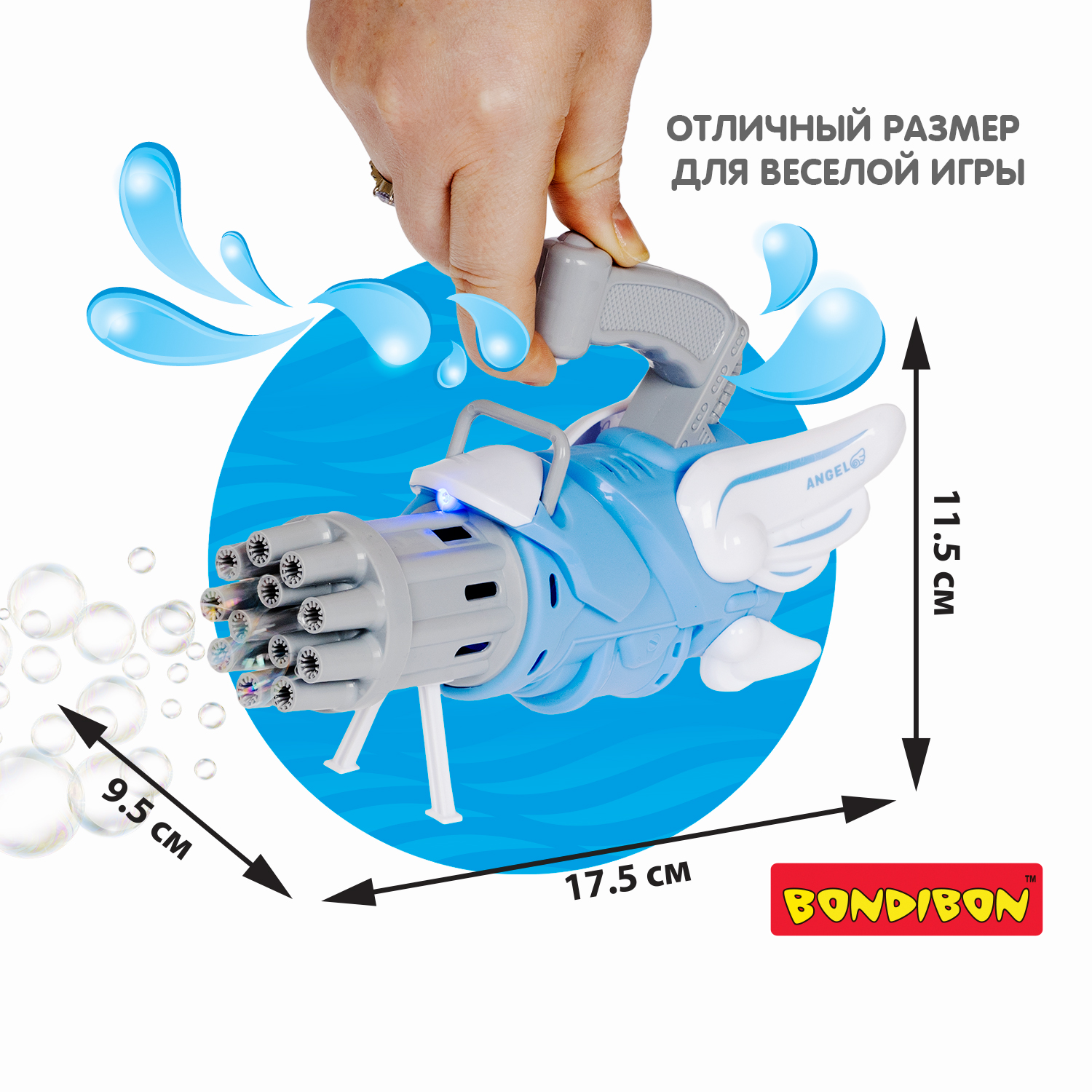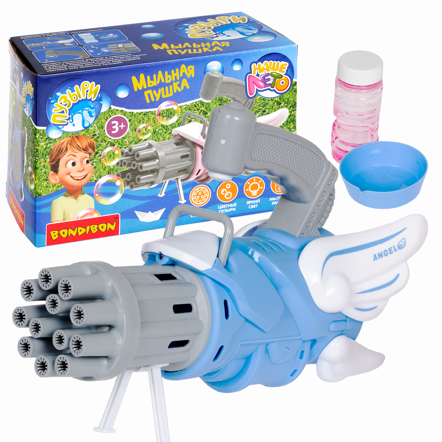 Генератор мыльных пузырей от Bondibon – супер ПУШКА, светится, пускает цветные пузыри мощным потоком и дарит море радости! Классный дизайн не оставит никого равнодушным! Мыльные пузыри - одна из любимых игрушек для детей. Что может быть веселее, чем устроить мыльное шоу с пузырями или перестрелки из водных пистолетов на улице, даче или в бассейне? Дети не только развлекаются, в процессе такой игры у ребенка совершенствуется зрительное восприятие, развиваются социальные навыки и зрительно-моторная координация. Работает мыльная пушка очень просто. Налейте мыльный раствор в тарелочку. Погрузите стволы пушки в раствор. Поднимите пушку и нажмите кнопку для старта. Запускайте световое шоу мыльных пузырей сразу из 12 стволов! Пушку можно использовать как маленький вентилятор. Актуально в жару! В комплект входит: - голубой пистолет, 12 стволов - мыльный раствор 50мл - тарелочка. Бластер работает от 3 батареек тип АА. Батарейки в набор не входят. Серия Наше Лето. Возраст 3+