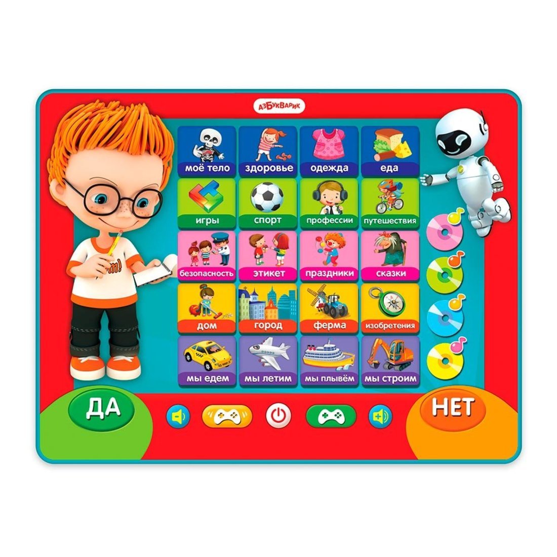 Детский развивающий планшет красного цвета. Выполнен из прочных, безопасных для здоровья материалов. Оснащен звуковыми эффектами, что сделает игру с ним еще более интересной и увлекательной. Поможет ребенку весело и с пользой провести время, решая всевозможные задачки. Удобно брать с собой. Этот говорящий планшетик – прекрасный подарок для маленьких эрудитов! 200 умных вопросов, 20 игровых тем, 3 уровня – играй и узнавай много интересного! Выбирай одну из увлекательных викторин – «Марафон» или «Фортуна». Отвечай на вопросы с весёлым Максом и становись Суперзнатоком. А мини-плеер с любимыми песенками («Песенка друзей», «Пусть бегут неуклюже», «Улыбка», «Танец маленьких утят») поднимет настроение. Ответил на все вопросы? Тогда попробуй отгадать загадки про животных! Найди QR-код на бесплатное скачивание 20 интерактивных загадок в приложении "Азбукварика".