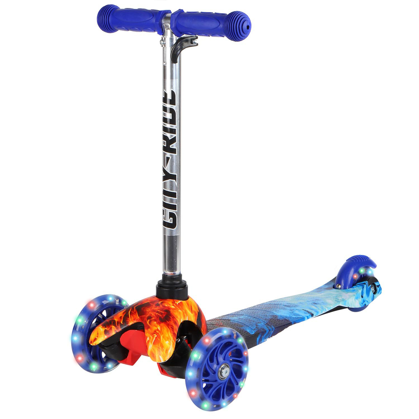 Детский трехколесный самокат с гидрографикой – отличный самокат для веселых поездок • Материал основы: PP + нейлон • Красочная принтованная платформа непременно понравится юному гонщику • Телескопический алюминиевый руль обеспечит идеальную настройку под рост ребенка • Резиновая рукоятка на руле имеет специальные ограничители, которые предотвратят соскальзывание рук и сделают поездку более безопасной • Рулевая стойка наклоняется в нужную сторону, что позволяет уверенно держаться в поворотах, сохраняя равновесие • Переднее колесо PU диаметром 110 мм и заднее колесо диаметром 76 мм придают самокату хорошую устойчивость • Колеса со светодиодами сделают катание более веселым и интересным • Надежный ножной тормоз позволит быстро остановить самокат перед препятствием • Подшипник ABEC-5 обеспечивает плавный ход и превосходную маневренность Размеры: 55 х 21,5 х 66 см Размеры основы: 51 х 11 см Максимальная нагрузка: 40 кг Возраст: от 3 лет