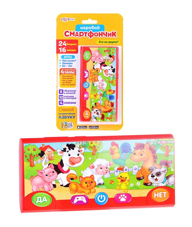 Яркий игрушечный смартфон красного цвета для детей старше 2 лет. Оснащен звуковыми эффектами, что сделает игру с ним еще более интересной и увлекательной. Выполнен из качественных, безопасных материалов. Поможет ребенку весело и с пользой провести время. На яркой картинке-экранчике вас встретят забавные зверюшки. Они загадают интересные загадки о себе. Можно сыграть в увлекательную игру «ДА – НЕТ», угадывать голоса зверюшек, слушать песенки, сказки и танцевальные мелодии. Также на нём записаны песенки-потешки: "Петушок", "Раным-рано поутру", "Топ-топ, топотушки", "Кошкин дом", "Калинка", "Ладушки", "Солнышко-колоколнышко", "Дождик", сказки: "Бычок – смоляной бочок", "Петушок и бобовое зёрнышко", "Кот, петух и лиса", "Три поросёнка" и просто любимые мелодии: "Собачий вальс", "Танец маленьких утят", "Калинка", "Ладушки". Бонус от «Азбукварика»: с новым приложением для смартфона или планшета малыш быстро и легко выучит буквы (QR-код для скачивания интерактивной азбуки – внутри упаковки).
