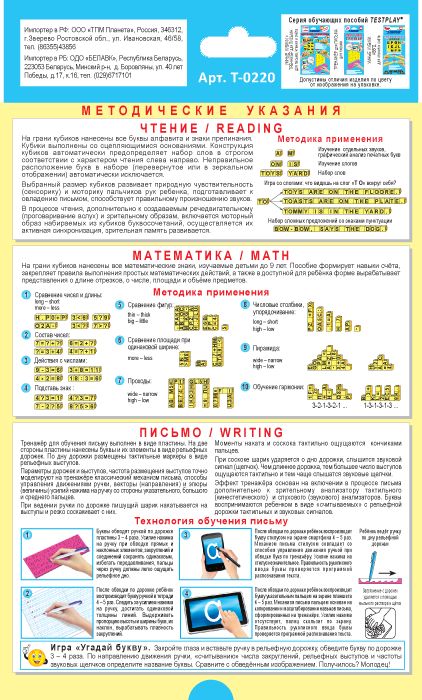 4+.Пособие-набор из 36 кубиков, на гранях которых написаны буквы английского алфавита, знаки препинания, цифры и знаки математических действий. Благодаря специальной конструкции (выступ с одной стороны и отверстие с другой), кубики могут скрепляться между собой. Таким образом можно составлять слова, предложения, примеры. Так как кубики можно скреплять только определенным способом, ребенок не сможет расположить их неправильно (зеркально или к верх ногами), что важно на этапе обучения, чтобы не сформировались неправильные представления о буквах. Количество букв, цифр и знаков на гранях кубиков выбрано с учетом частоты их использования и позволяет составлять достаточно сложные слова, предложения и примеры. Длина грани кубиков - 1,5 см. Детям удобно их держать и скреплять, в процессе игры тренируется мелкая моторика рук. При составлении слов из Умных кубиков работает сразу несколько каналов восприятия информации: зрительный и кинестетический (сенсорный), что способствует лучшему запоминанию. При использовании кубиков для обучения математике можно не только составлять примеры, но и дать представление о длине отрезков, площади и объеме предметов. В комплекте: 36 умных кубиков содержат 144 грани с буквами, цифрами и знаками препинания. В комплекте от 2 до 6 шт. каждой буквы и цифры в зависимости от частоты их использования. Тренажер для письма - пластина, которая содержит кассу элементов английских букв и соединений, 30 печатных букв, 58 прописных и строчных букв для классического (поэлементного) и безотрывного письма, 10 цифр.